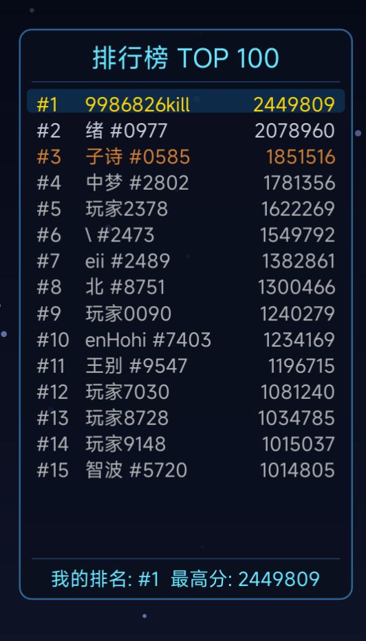 目前已经有上千玩家游玩了,不过排行榜只显示前15名。并且我在游戏已经排行第一很久了,看大家都还没超越我。于是我来说说高分攻略吧。游戏重要的不是怎么通关,而是怎么取得高分。游戏分的构成除了基础得分以为,最重要的就是倍率加成!比如,无伤阶段,玩家获得的积分会有额外1.5倍的加成。所以,我个人觉得,防御是必选的,因为受到攻击防御是不会影响加成的。接下来就是多发子弹,这个可以快速的清理小怪,打