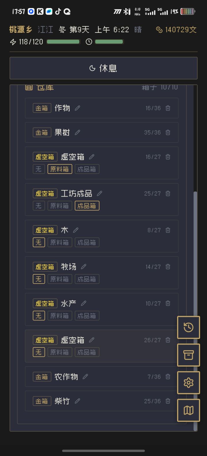 6.最最最需要改的,就是种子为什么不能放进仓库的箱子里面还要占用我的背包!建议将种子和烹饪的菜肴不占背包或者在背包里面加一个专门放种子和菜肴的行囊,百物铺里面可升级或者加工坊用材料升级