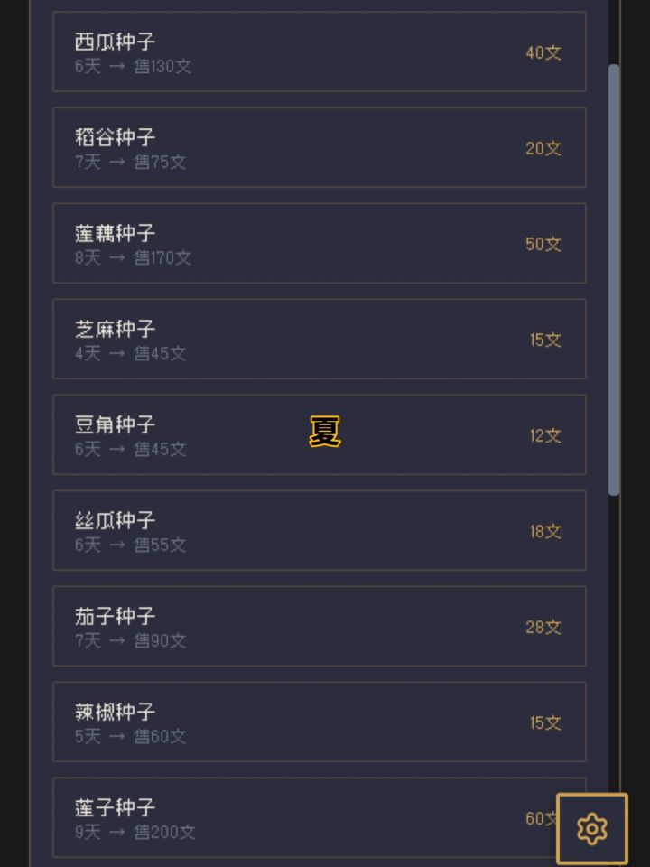 春桃夏辣椒秋红枣,都是多茬除了辣椒能酿酒,冬天只有韭菜是多茬但很鸡肋所以我选雪莲,酿酒桂花酿最贵桃花酒次之,果树推荐柿子1. 橘子:售价70文,恢复+14体力 / +7HP2. 石榴:售价95文,恢复+19体力 / +9HP3. 梅花:售价100文,恢复+20体力 /+10HP4. 柿饼:售价170文,恢复+42体力 /+21HP5. 柿子:售价150文,恢复+30体力 /+15HP6
