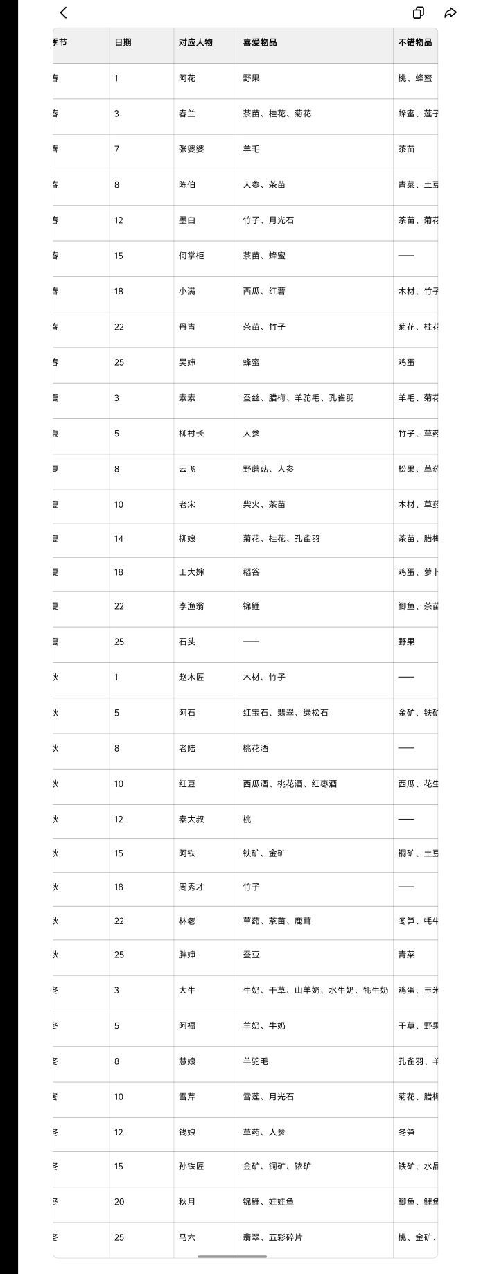 普通资质物品喜欢45喜爱80好感度不互动的话每天降2点宠物家畜人都是一季28天一星期7天每个星期能送2次牧场:建议养一只羊驼和一只羊刷NPC礼物好感满了以后卖掉,鸡可以养一到两只不用卖因为很多菜可以用鸡蛋做,其他的全养孔雀和猪NPC不在村原因:阿石,周秀才,村长,雪琴:体制内工作双休出去玩了赵木匠,孙铁匠,阿铁,小满:打螺丝的星期天不上班出去玩了云飞:自由职业人135进山打野不在村,