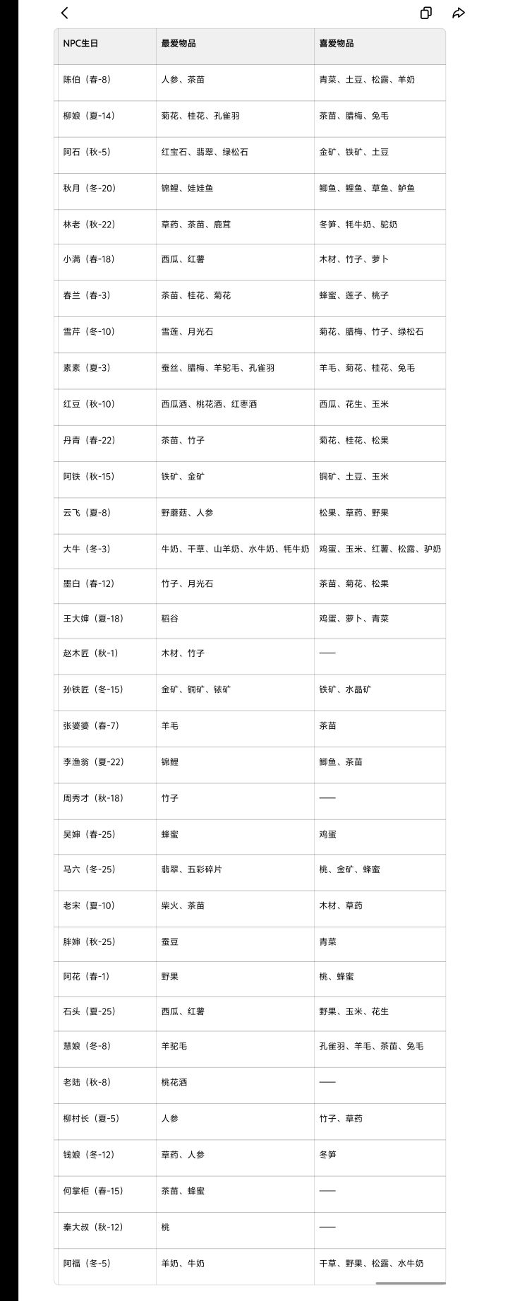 普通资质物品喜欢45喜爱80好感度不互动的话每天降2点宠物家畜人都是一季28天一星期7天每个星期能送2次牧场:建议养一只羊驼和一只羊刷NPC礼物好感满了以后卖掉,鸡可以养一到两只不用卖因为很多菜可以用鸡蛋做,其他的全养孔雀和猪NPC不在村原因:阿石,周秀才,村长,雪琴:体制内工作双休出去玩了赵木匠,孙铁匠,阿铁,小满:打螺丝的星期天不上班出去玩了云飞:自由职业人135进山打野不在村,