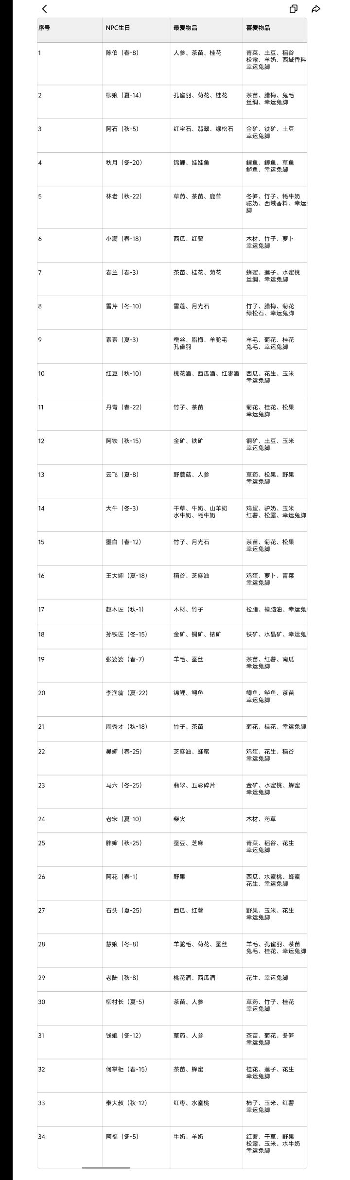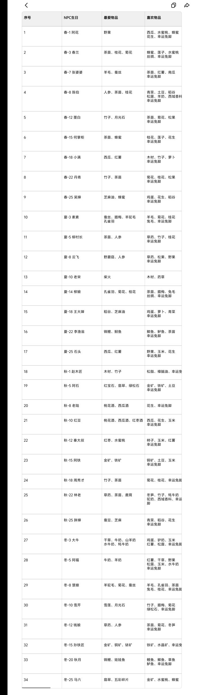 在群友补充下最爱和喜欢全都有了,幸运兔脚全角色喜欢,游商星期五,七出现,兔子产蓝色兔毛时开始产兔脚12只兔子3-5天1-2个好像跟天气有关牧场:建议养一只羊驼和一只羊刷NPC礼物好感满了以后卖掉,鸡可以养一到两只不用卖因为很多菜可以用鸡蛋做,其他的全养孔雀和猪NPC不在村原因:阿石,周秀才,村长,雪琴:体制内工作双休出去玩了赵木匠,孙铁匠,阿铁,小满:打螺丝的星期天不上班出去玩了云飞:自