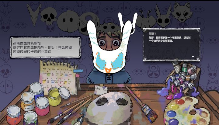 画完以后把面具拖到顾客脸上就可以开始评鉴了。评鉴的过程比较长需要耐心等待。不过屏幕完全没有什么新的反应让人比较的不安。可以考虑添加一个评鉴中的进度条。或者添加一点简单有趣的小游戏让玩家来消磨时间。比如说磨面具、安排日程、准备颜料调配、预制填色小装饰之类的。