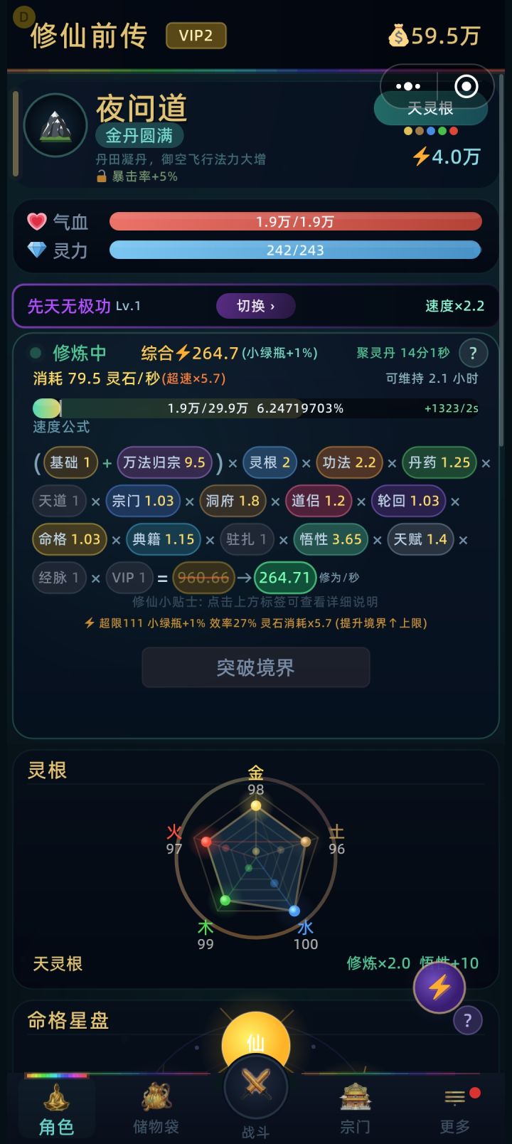 - 数值透明,策略一目了然:修炼速度公式直接摆在台面上,基础、灵根、悟性、宗门加成等关键信息清晰呈现,不用反复摸索就能精准找到提升效率的方向,告别了同类游戏中“数值模糊、瞎玩踩坑”的问题,新手也能快速理清养成思路。