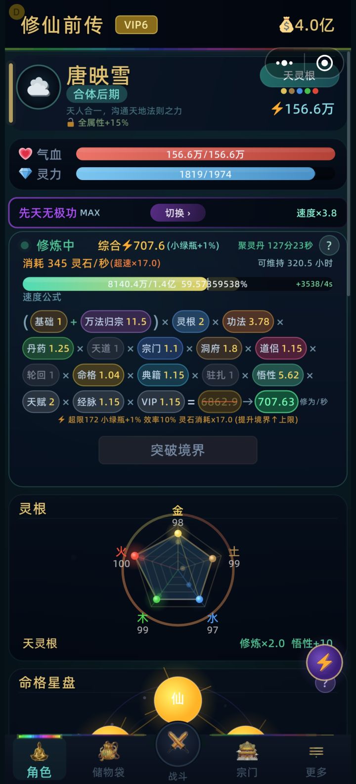 - 界面简洁,上手快:UI设计很清爽,角色、灵根、命格星盘等信息一目了然,新手也能快速get到核心玩法,没有学习成本。