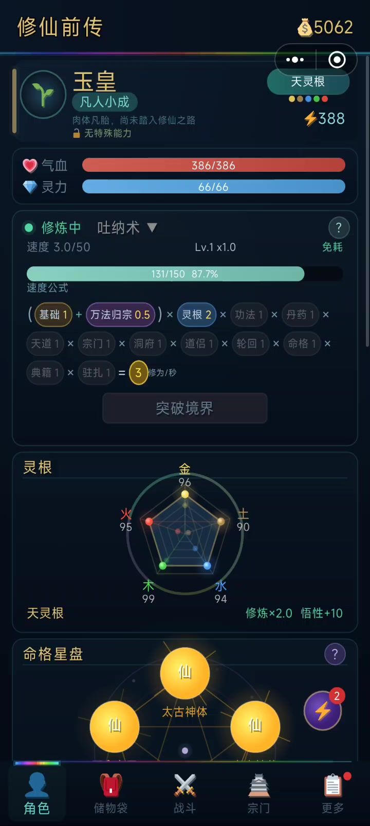 一、 核心思路主叠血量(生命)+防御。利用装备被动技能“烈焰反击”作为主要输出手段,实现硬刚BOSS、安稳通关。二、 开局天赋推荐(天灵根&五金天赋)冲榜追求战力: 5×太古神体(攻击加成高,战力数值好看)。追求快速通关: 5×混沌之体(全属性+25%,血防成型极快)。平民/休闲: 凑齐5金即可,甚至随缘天赋也能靠此套路轻松通关。三、 经济策略:快速积攒灵石前期搞钱: 炼制“培元丹”
