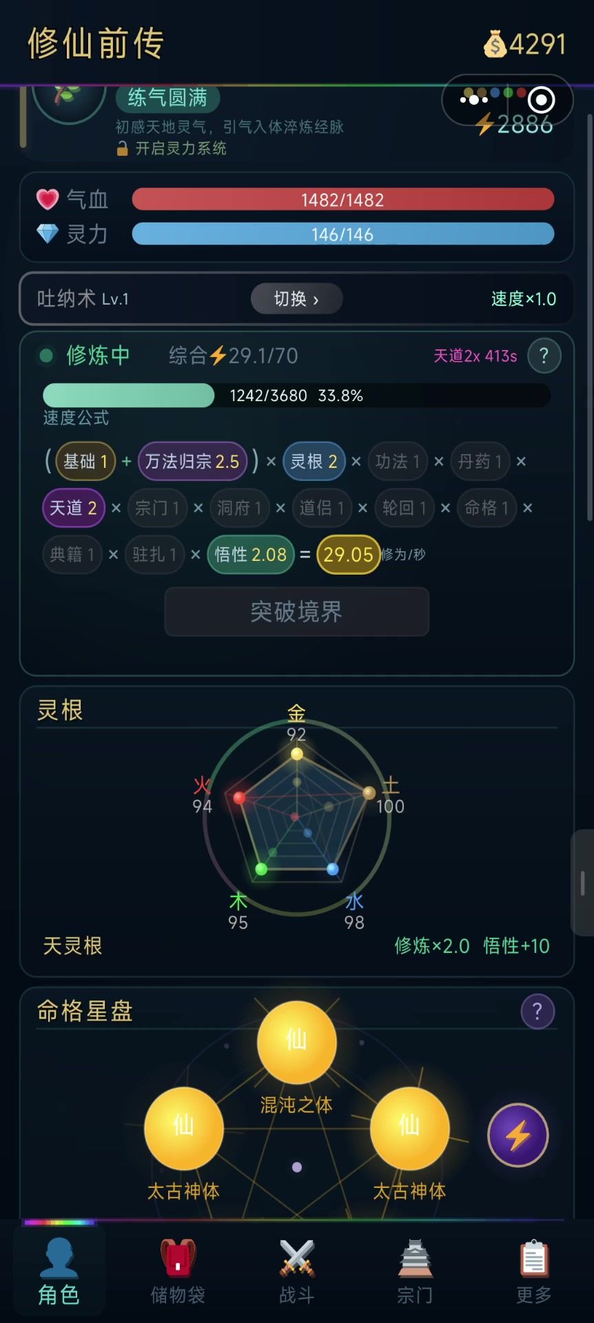 一、 核心思路主叠血量(生命)+防御。利用装备被动技能“烈焰反击”作为主要输出手段,实现硬刚BOSS、安稳通关。二、 开局天赋推荐(天灵根&五金天赋)冲榜追求战力: 5×太古神体(攻击加成高,战力数值好看)。追求快速通关: 5×混沌之体(全属性+25%,血防成型极快)。平民/休闲: 凑齐5金即可,甚至随缘天赋也能靠此套路轻松通关。三、 经济策略:快速积攒灵石前期搞钱: 炼制“培元丹”