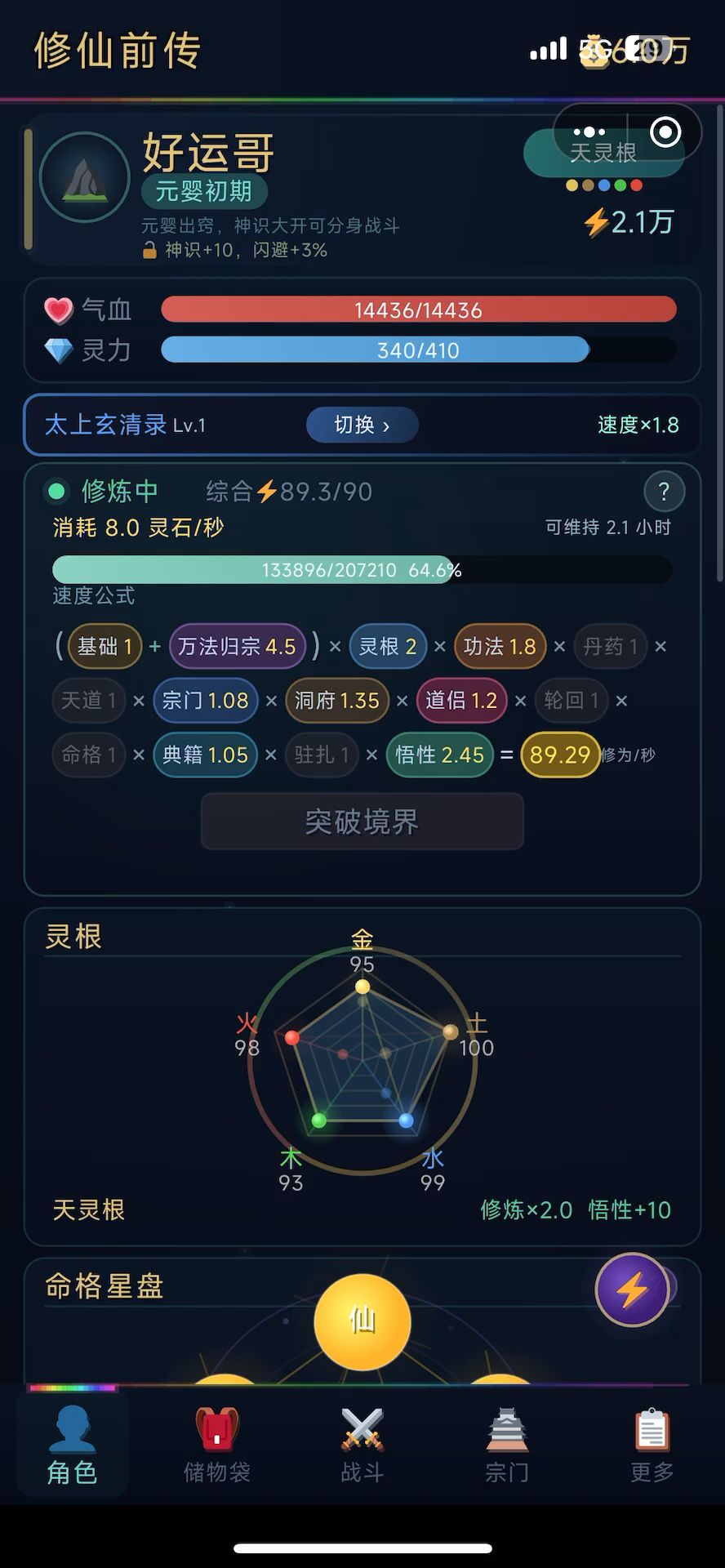灵根好刷直接天 命格将近半小时2仙2极就这吧 本来想刷3仙的 肝不动了