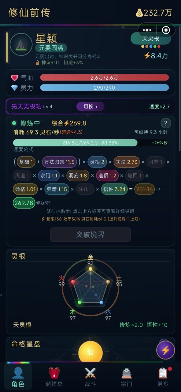一、 核心思路主叠血量(生命)+防御。利用装备被动技能“烈焰反击”作为主要输出手段,实现硬刚BOSS、安稳通关。二、 开局天赋推荐(天灵根&五金天赋)冲榜追求战力: 5×太古神体(攻击加成高,战力数值好看)。追求快速通关: 5×混沌之体(全属性+25%,血防成型极快)。平民/休闲: 凑齐5金即可,甚至随缘天赋也能靠此套路轻松通关。三、 经济策略:快速积攒灵石前期搞钱: 炼制“培元丹”