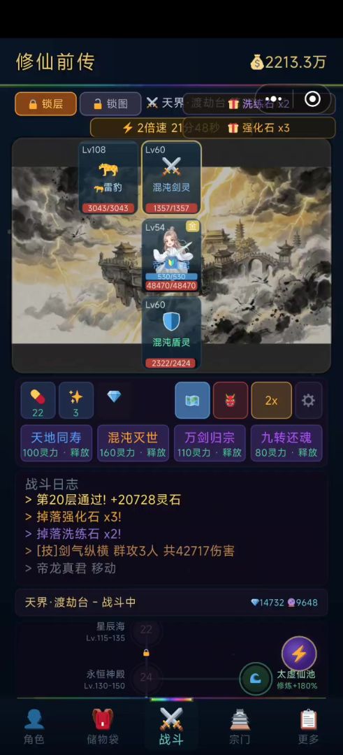 一、 核心思路主叠血量(生命)+防御。利用装备被动技能“烈焰反击”作为主要输出手段,实现硬刚BOSS、安稳通关。二、 开局天赋推荐(天灵根&五金天赋)冲榜追求战力: 5×太古神体(攻击加成高,战力数值好看)。追求快速通关: 5×混沌之体(全属性+25%,血防成型极快)。平民/休闲: 凑齐5金即可,甚至随缘天赋也能靠此套路轻松通关。三、 经济策略:快速积攒灵石前期搞钱: 炼制“培元丹”