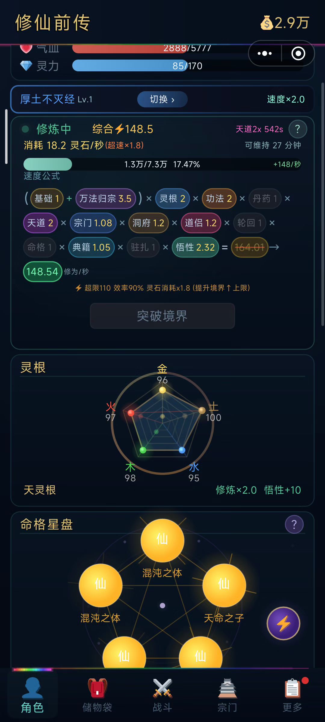 一、 核心思路主叠血量(生命)+防御。利用装备被动技能“烈焰反击”作为主要输出手段,实现硬刚BOSS、安稳通关。二、 开局天赋推荐(天灵根&五金天赋)冲榜追求战力: 5×太古神体(攻击加成高,战力数值好看)。追求快速通关: 5×混沌之体(全属性+25%,血防成型极快)。平民/休闲: 凑齐5金即可,甚至随缘天赋也能靠此套路轻松通关。三、 经济策略:快速积攒灵石前期搞钱: 炼制“培元丹”