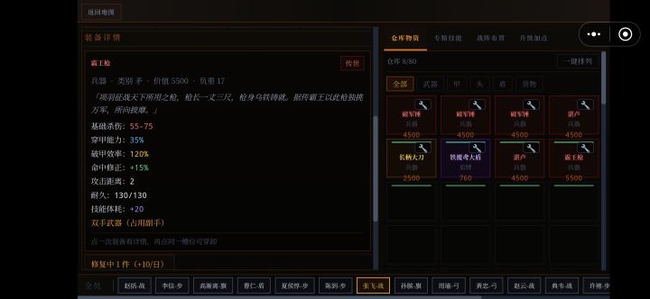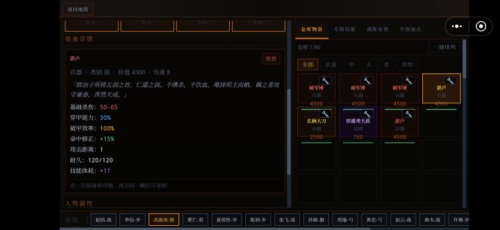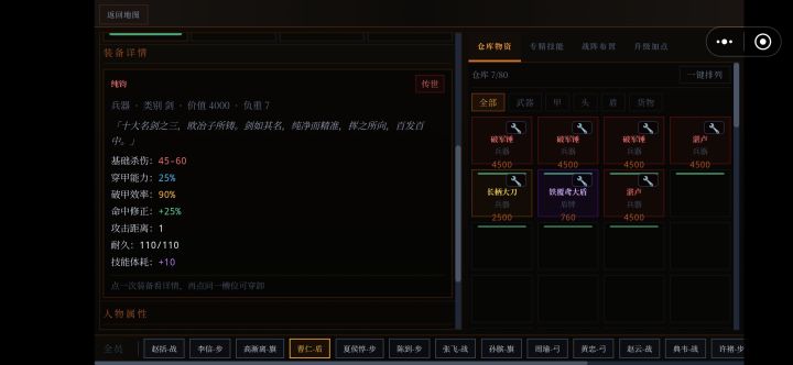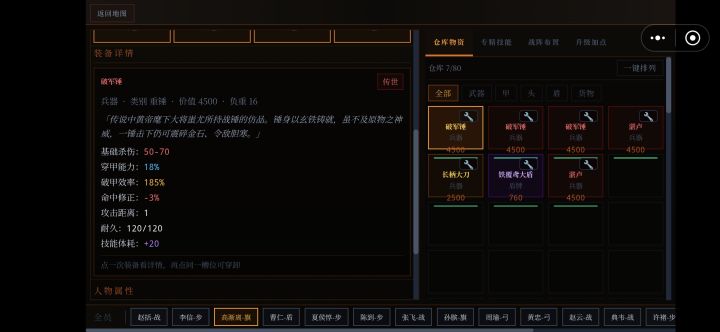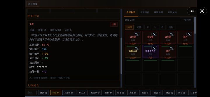 单手武系列1.干将-铸剑遗址2.湛卢-欧冶子古窑3.纯钧-欧冶子古窑4.破军锤-蚩尤古战场5.雷公鞭-荆轲义士墓双手武系列1.霸王枪-霸王陵2.项羽戟-霸王陵3.龙牙刀-龙牙山寨4.金刚锤-北疆铁矿深处远程系列1.连弩-养由基射猎场2.养由基弓-养由基射猎场防护系列1.犀皮甲-犀皮工作坊遗址2.金缕玄甲-虎贲将军墓3.虎贲盔-虎贲将军墓4.玄武盾-犀皮工作坊遗址
