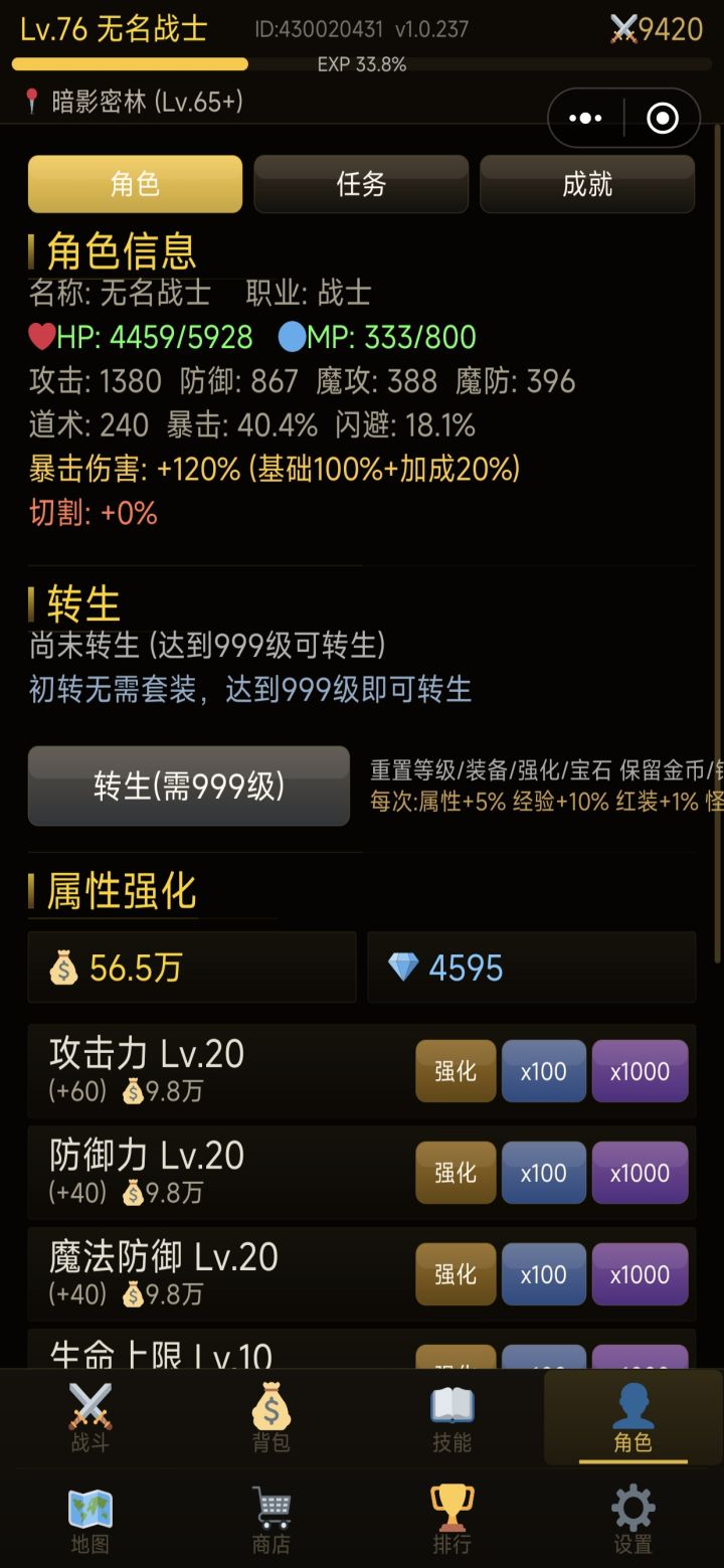转生以后,就可以疯狂打红装!无限爬塔刷金币了!!目标攻击点到1w级!!!
