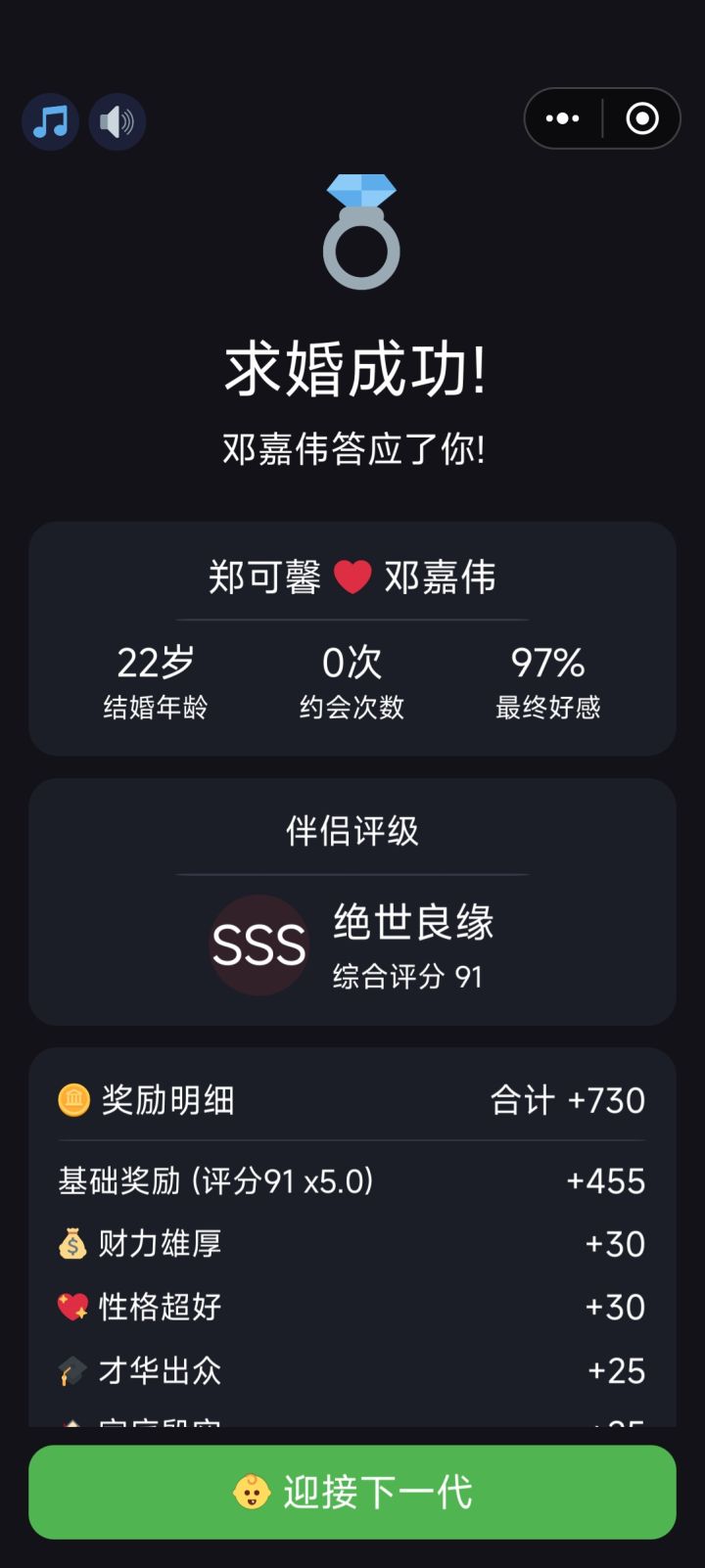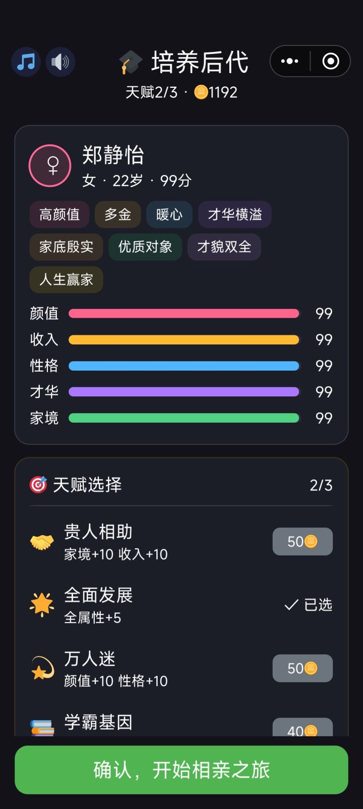 一切的核心都是你的五维要足够高,然后在相亲市场上去找也足够高的人,才能有更好的后代,然后他在相亲市场上权重也就更高,但同时你的选择也很重要,会影响好感度。吐槽一下:为什么后代不管儿子女儿都和夫妻两人不同姓,家族连贯代入感不强()
