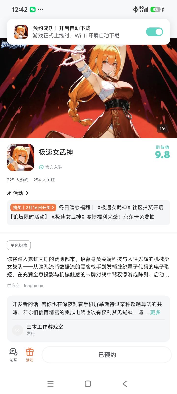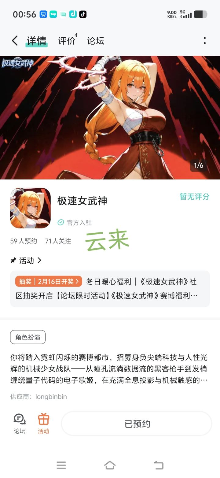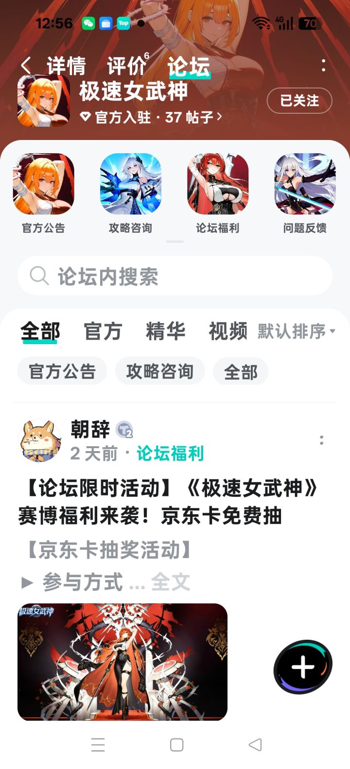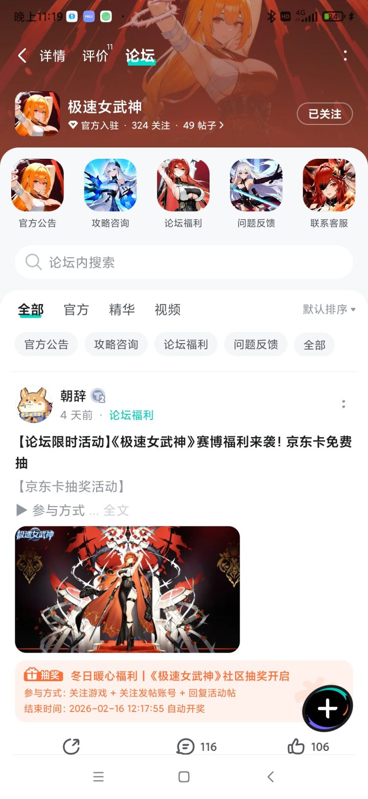 【京东卡抽奖活动】▶ 参与方式1.点击关注《极速女武神》并发新帖晒截图2.在本帖下方评论区分享发帖链接即可【奖品发放】到达开奖时间后,由taptap系统随机抽取符合要求的幸运玩家,自动发放兑换码(对于同一账号大量故意发布评论刷楼层导致其他玩家中奖概率降低的行为的用户,将会可能被取消参与资格!)▶ 活动奖励活动结束后将抽取1位幸运儿获得1张京东卡关注社区解锁更多机缘:📢 第一时间获取