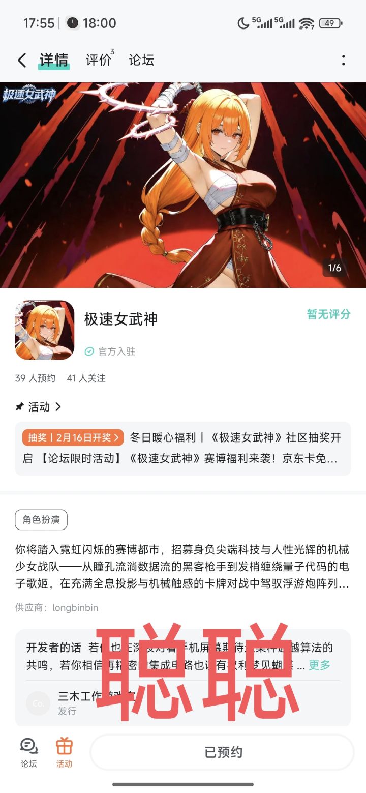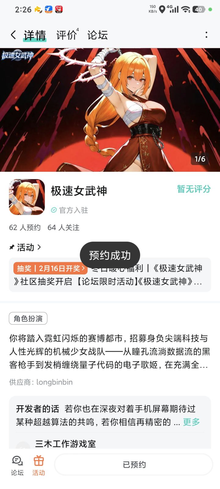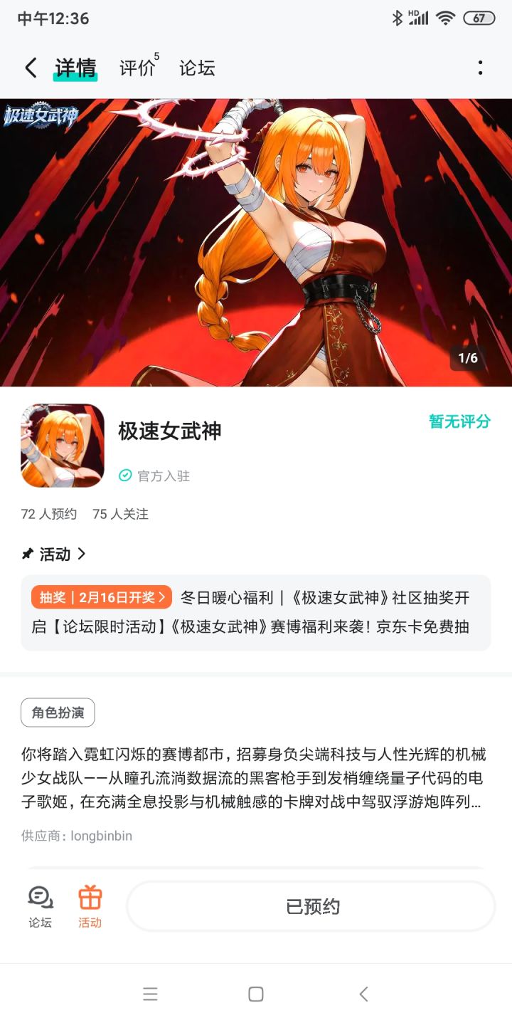 已关注,预约,期待一下极速女武神上线,希望极速女武神越来越好,蒸蒸日上,人气超多。