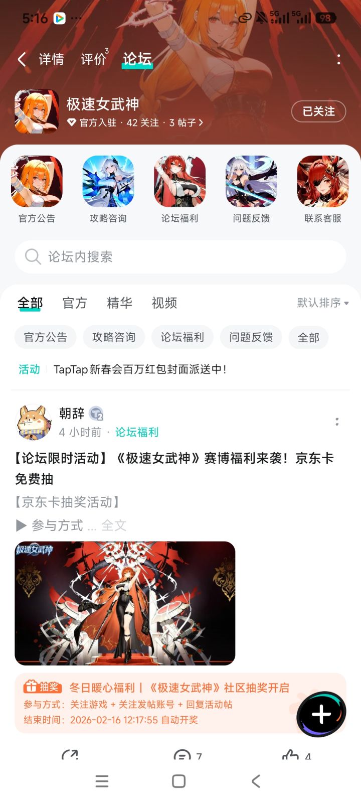 【京东卡抽奖活动】▶ 参与方式1.点击关注《极速女武神》并发新帖晒截图2.在本帖下方评论区分享发帖链接即可【奖品发放】到达开奖时间后,由taptap系统随机抽取符合要求的幸运玩家,自动发放兑换码(对于同一账号大量故意发布评论刷楼层导致其他玩家中奖概率降低的行为的用户,将会可能被取消参与资格!)▶ 活动奖励活动结束后将抽取1位幸运儿获得1张京东卡关注社区解锁更多机缘:📢 第一时间获取
