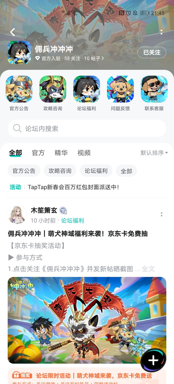 【京东卡抽奖活动】▶ 参与方式1.点击关注《佣兵冲冲冲》并发新帖晒截图2.在本帖下方评论区分享发帖链接即可【奖品发放】到达开奖时间后,由taptap系统随机抽取符合要求的幸运玩家,自动发放兑换码(对于同一账号大量故意发布评论刷楼层导致其他玩家中奖概率降低的行为的用户,将会可能被取消参与资格!)▶ 活动奖励活动结束后将抽取1位幸运儿获得1张京东卡关注社区解锁更多机缘:📢 第一时间获取