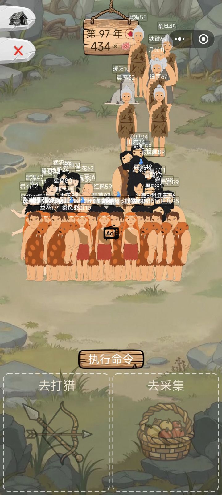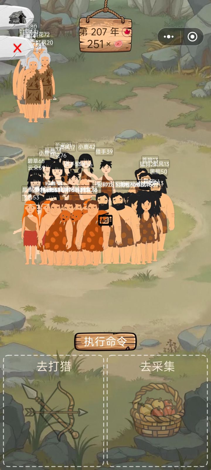 攻略1.不建议打猎,会受伤吃白食。只选采集就好2.春季,夏季采集收获是人数的2倍,秋季是3倍,冬季是人数同等,前期缺少食物时,秋季全部排出去采集,冬季可以优先生育3.一季只会有一个怀上,所以不建议放太多人生育,浪费劳动力4.前期缺食物,可以按季节分配生育和采集,如果急缺男性或女性时,优先生育发展。后期有一定食物囤积后,可以放两男 两女在部落里生育,一旦有怀上或者老了的,拿其他人替换掉5.