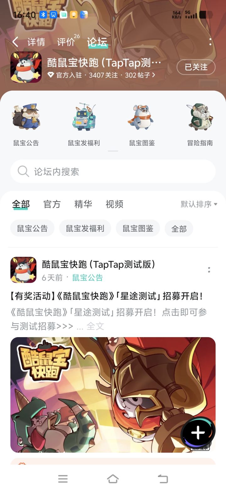 《酷鼠宝快跑》「星途测试」正式开启!点击即可参与测试>>>>>测试信息<<测试类型:限量删档不计费测试测试平台:安卓测试时间:2026年3月24日10:00-2026年3月31日23:59*本次「星途测试」所展示的内容均为开发中版本,测试内容不代表游戏的最终品质。「问题反馈」联系客服QQ:3574628668「星途测试」问题反馈&优化建议收集贴>>> 【参与方式】1.关注《酷鼠宝