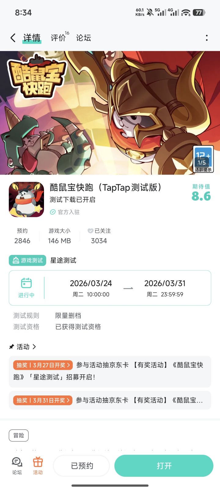 《酷鼠宝快跑》「星途测试」招募开启!点击即可参与测试招募>>>《酷鼠宝快跑》是一个角色卡牌养成游戏,在普通的一天,鼠宝们生活小镇的天空出现了一个巨大的时空裂缝。酷宝为了修补小镇上空的裂缝,进入了时空裂缝中......而时空裂缝连接着各个平行世界,乌萨玛尔、格林维尔、星港城...>>测试信息<<测试类型:限量删档不计费测试测试平台:安卓测试时间:2026年3月24日10:00-2026年