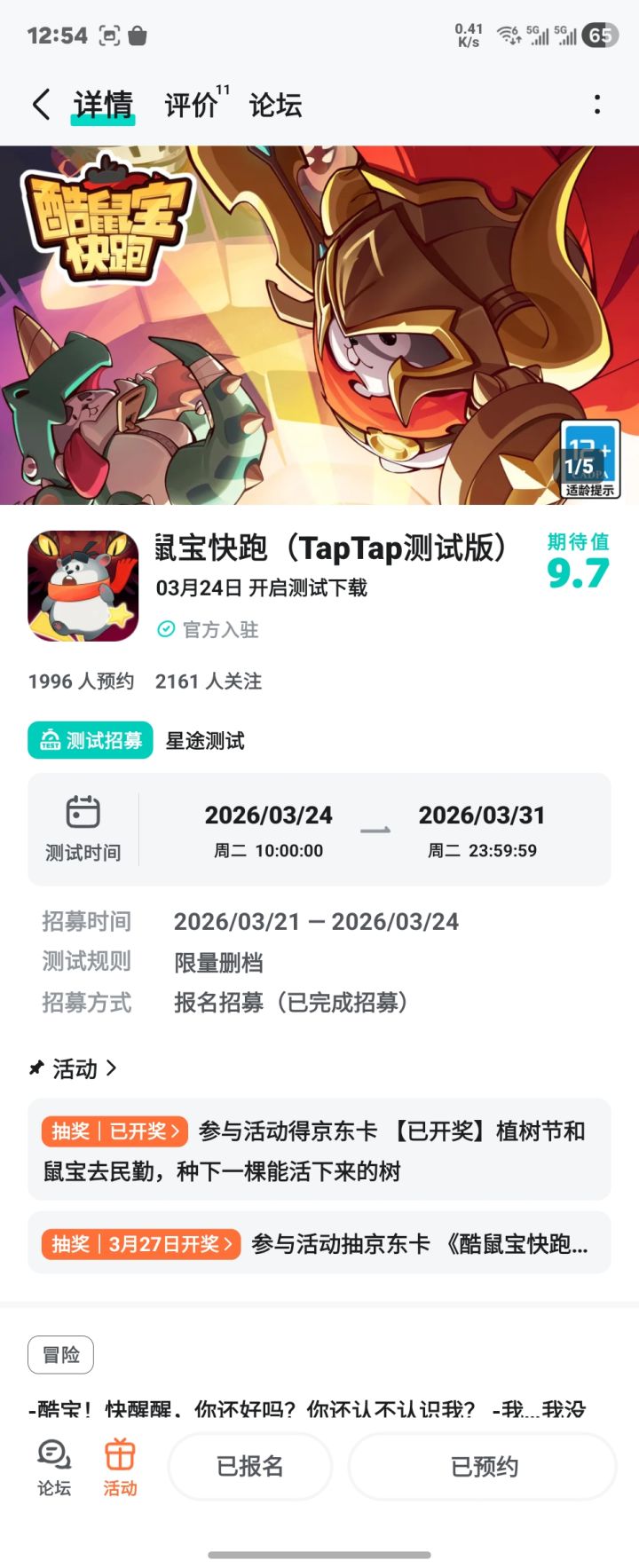 《酷鼠宝快跑》「星途测试」正式开启!点击即可参与测试>>>>>测试信息<<测试类型:限量删档不计费测试测试平台:安卓测试时间:2026年3月24日10:00-2026年3月31日23:59*本次「星途测试」所展示的内容均为开发中版本,测试内容不代表游戏的最终品质。「问题反馈」联系客服QQ:3574628668「星途测试」问题反馈&优化建议收集贴>>> 【参与方式】1.关注《酷鼠宝