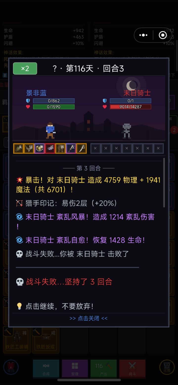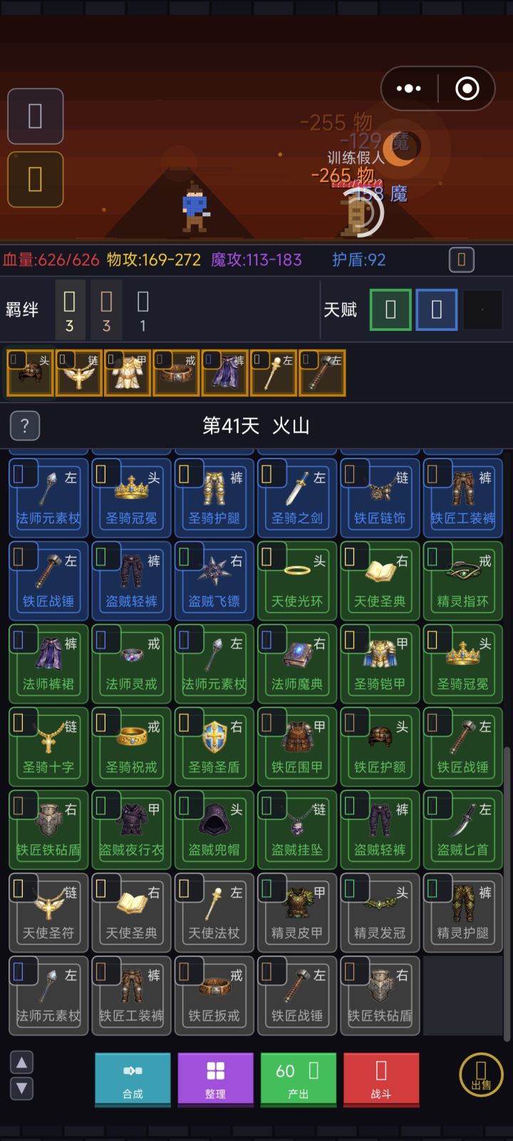 一、前言故事游戏以经典的勇者斗魔王为开篇,玩家通过不断战斗获取装备、合成更高级的装备,一步步挑战更强大的敌人。二、画风采用经典像素风格,角色设计鲜明、各具特色,整体观感明快且富有怀旧感。三、玩法机制核心循环清晰明了:打怪→获取装备→合成升级→选择天赋→挑战更强敌人。上手门槛极低,前期爽点密集,沉浸感强,往往不知不觉就投入一小时。四、引导衔接游戏内置简明的新手引导,虽然玩法本身足够简单
