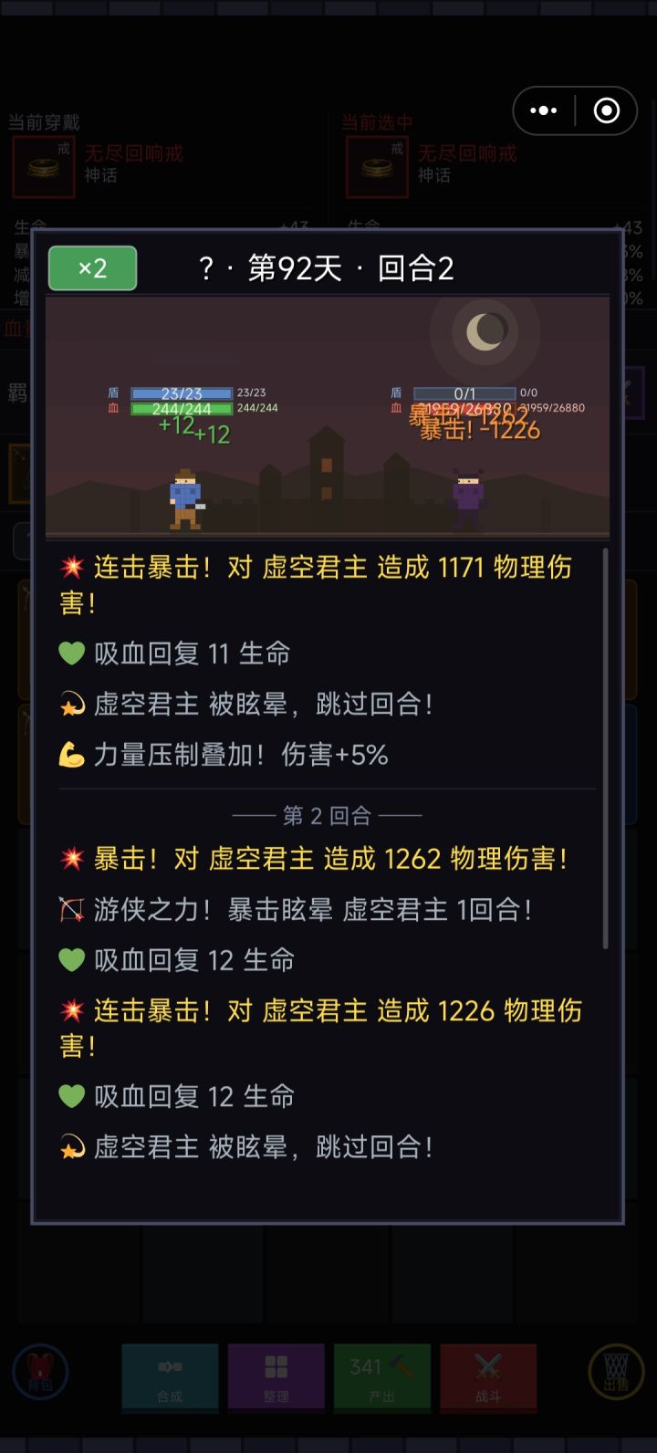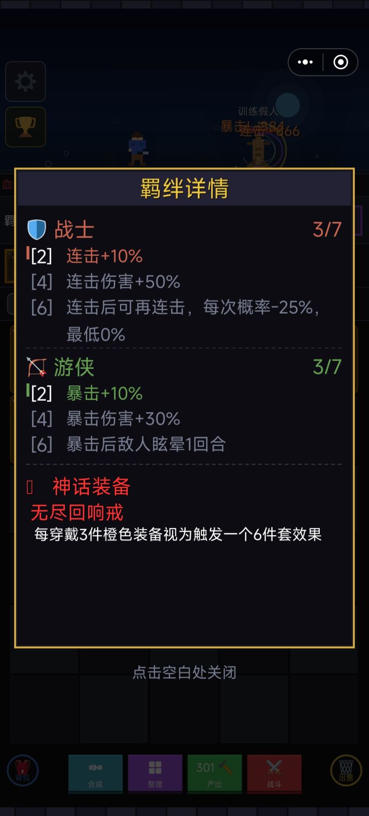 一、前言故事游戏以经典的勇者斗魔王为开篇,玩家通过不断战斗获取装备、合成更高级的装备,一步步挑战更强大的敌人。二、画风采用经典像素风格,角色设计鲜明、各具特色,整体观感明快且富有怀旧感。三、玩法机制核心循环清晰明了:打怪→获取装备→合成升级→选择天赋→挑战更强敌人。上手门槛极低,前期爽点密集,沉浸感强,往往不知不觉就投入一小时。四、引导衔接游戏内置简明的新手引导,虽然玩法本身足够简单