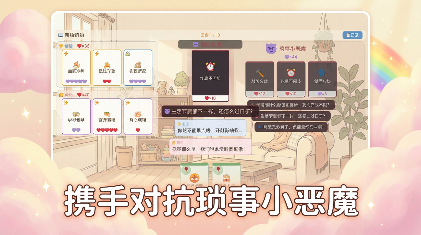一款关于家庭守护与幸福的卡牌策略游戏。爸爸妈妈携手对抗琐事小恶魔,用行动卡化解装修分歧、作息不同步等生活难题,守护家庭的爱与幸福,从新婚初始一路成长!