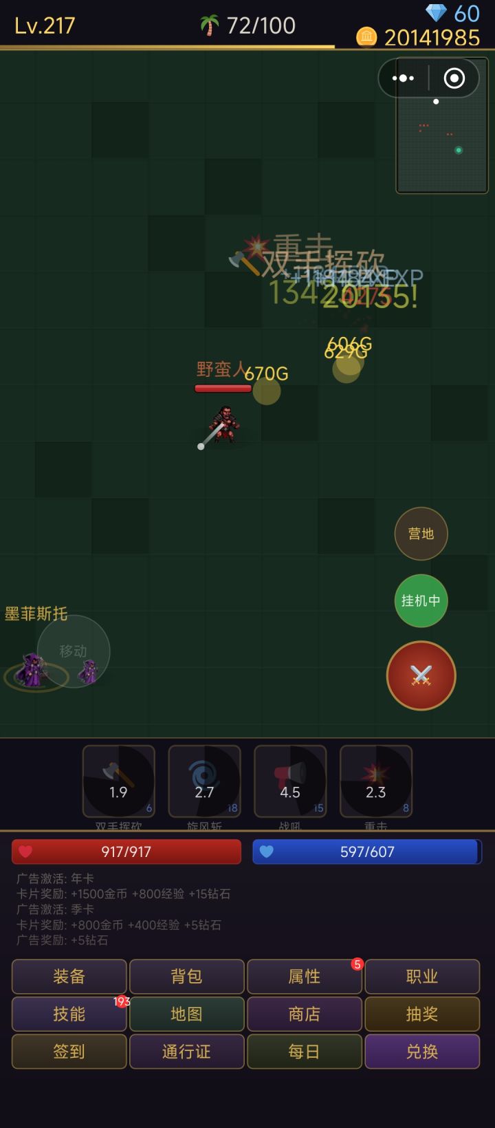 挂机好玩,跟暗黑破坏神一样,还有套装,看个广告还给终生卡,太给力了