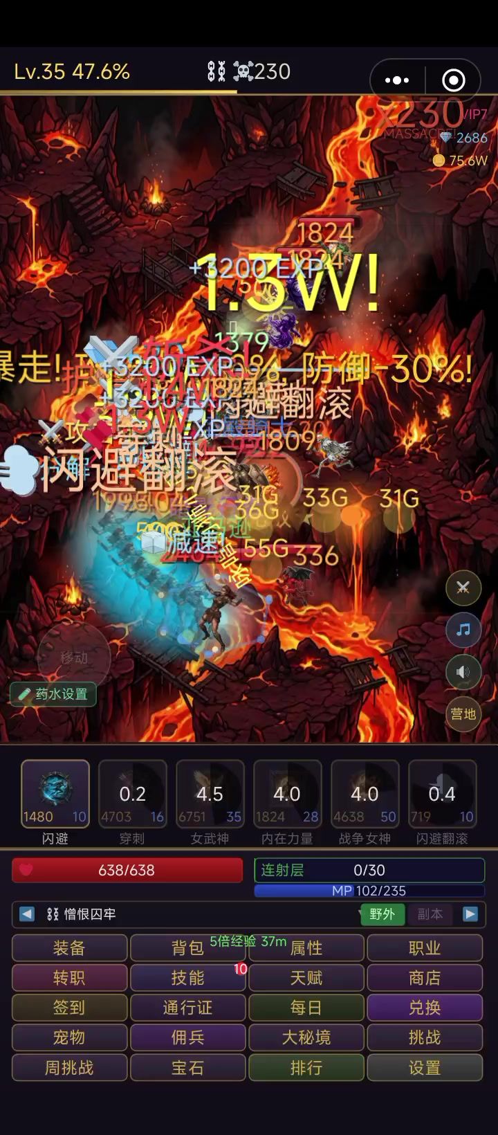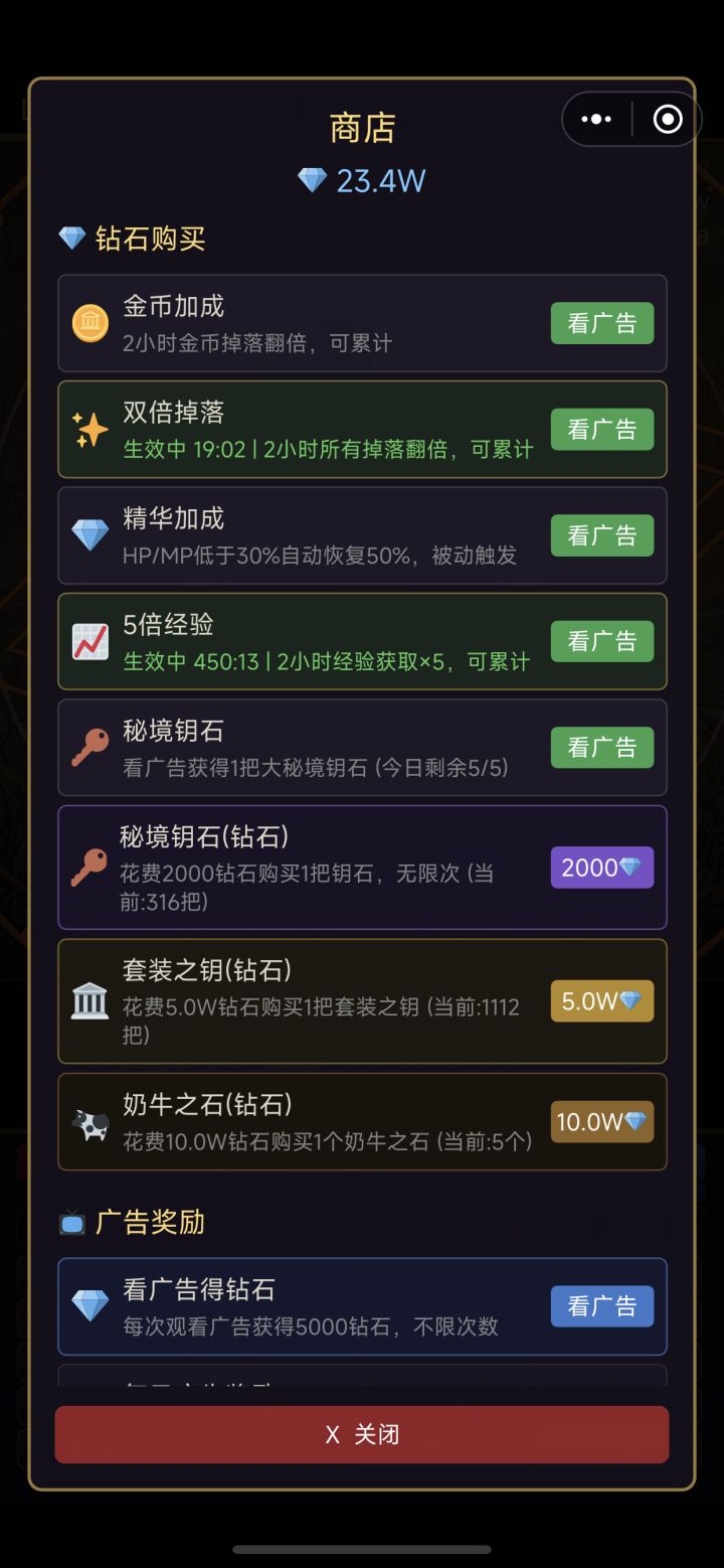 1.看广告!看广告!看广告!重要的事情说三遍,金币双倍(不是很重要)精华 双倍掉落 五倍经验 必看,底下的钥匙,广告激励前期基本用不到2.30级以前纯坐牢,升级会很慢。照着第一张图,慢慢刷,升级+装备获取,一直刷到折磨难度,或者简单难度刷到100级,晚上挂机的时候挂金装,然后选第一关折磨难度,挑战 大奶牛3.30级以后可以尝试大秘境。一般能打到15层,可以刷到比较能用暗金装备属性优先攻击+生命