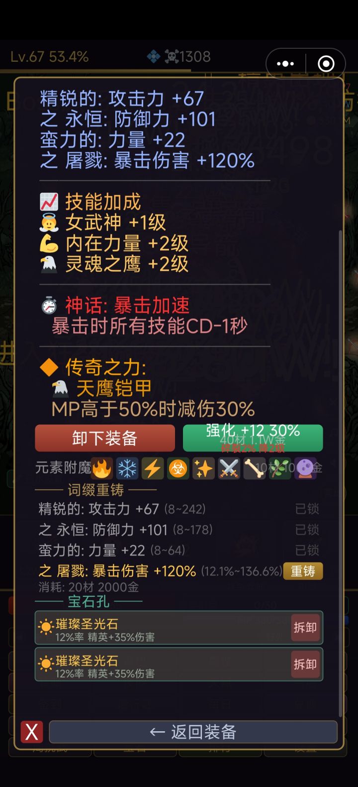 游戏开局无需复杂操作,直接扎根第一张基础地图开启挂机模式,这是整个养成流程的核心起点。前期不用急于切换更高难度或探索新地图,只要解锁第一张图的折磨难度,就全程死守这里持续挂机,这是性价比最高、效率最稳定的发育路线。 在折磨难度挂机的核心目标,就是刷取高品质神话装备,一旦掉落立刻进行萃取,优先筛选暴击属性、冷却缩减、技能概率二次释放这三大核心词条。只要成功凑齐关键效果,角色战力会迎来质的飞跃,直