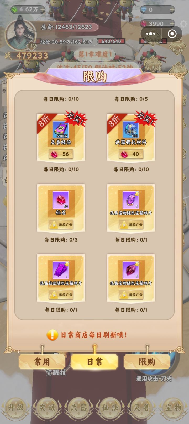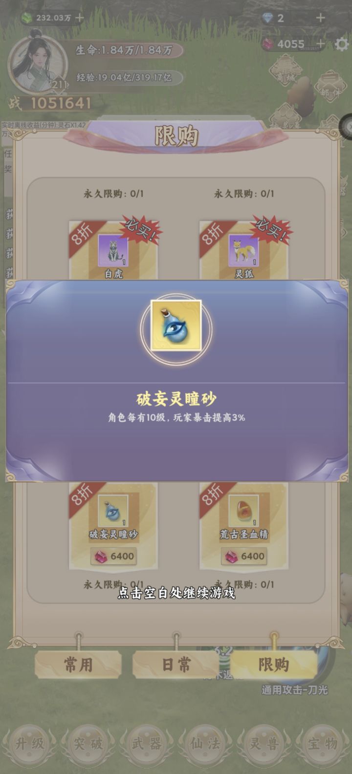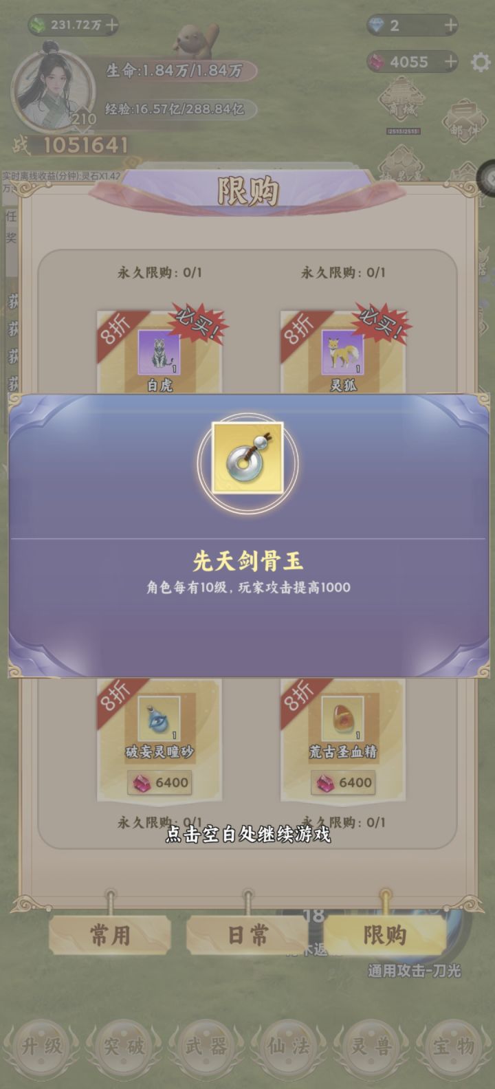 这个游戏节奏就是升级提升境界,按游戏中的任务走到第二章就基本熟悉了。不过要想顺利推图爽玩,首重攻击力,加攻击力的途径是升级加攻击点数,抽武器、制作和强化,升级灵兽附加,装备宝物附加。有了灵兽附加的攻击力,加点攻击不建议,先把暴击率提高到百分百,剩余再加上。抽武器就是挂机灵石区,攒够第三档次的金色宝箱十连的灵石再抽,有没有抽到本章极品金武都可以了,不强求。升级灵兽是既需要灵石又需要灵兽经验,都要挂在