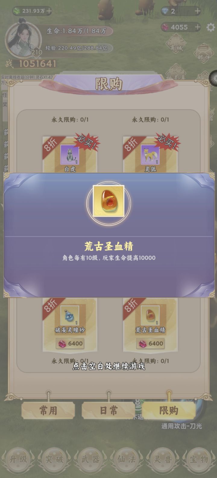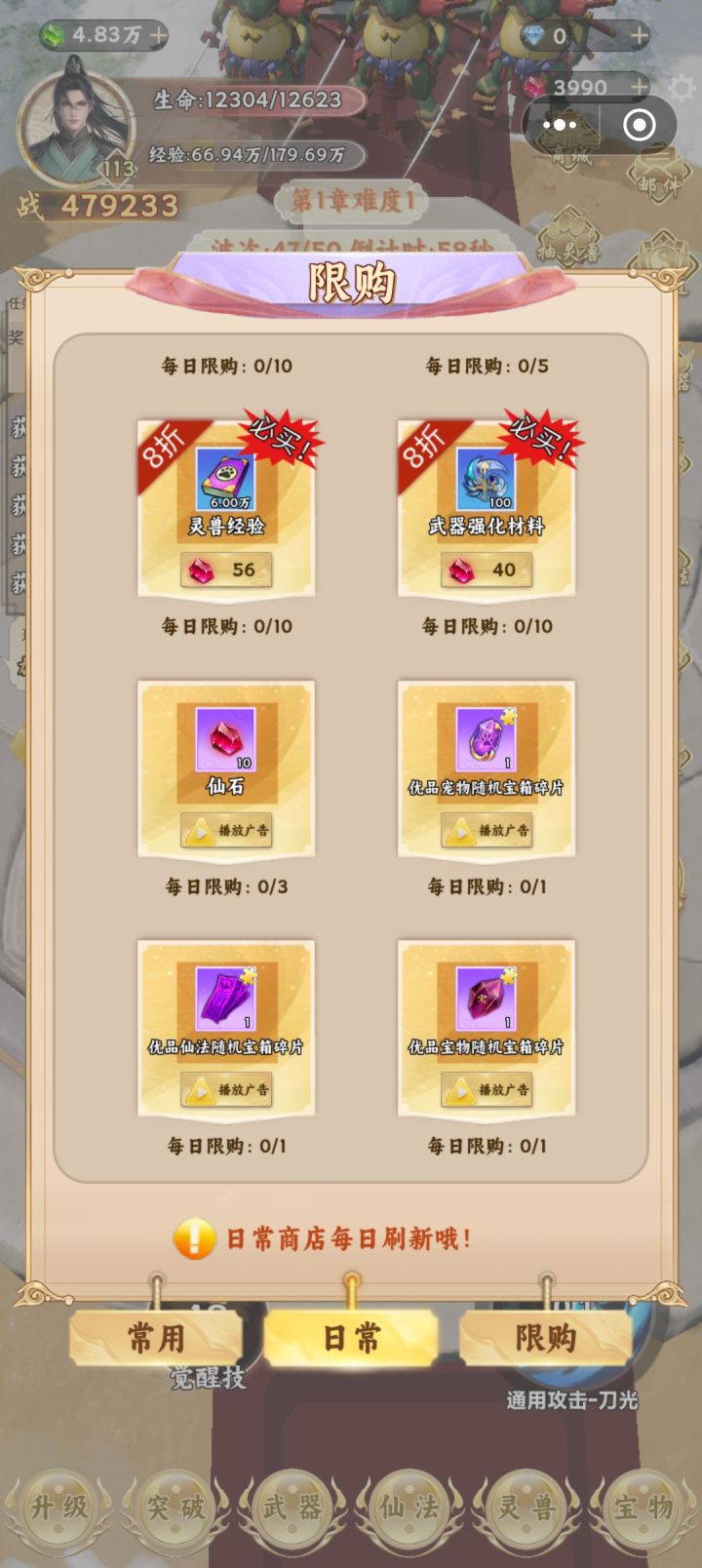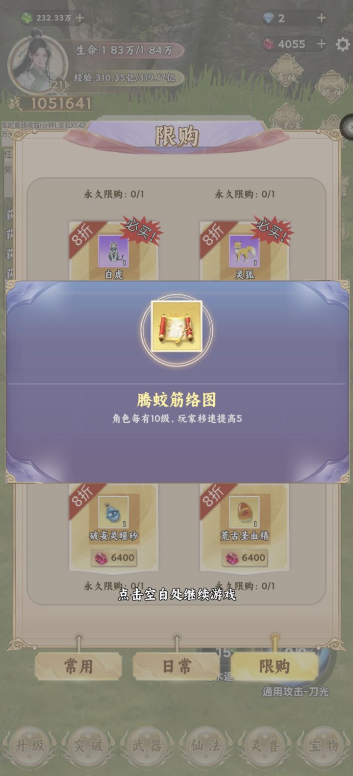 这个游戏节奏就是升级提升境界,按游戏中的任务走到第二章就基本熟悉了。不过要想顺利推图爽玩,首重攻击力,加攻击力的途径是升级加攻击点数,抽武器、制作和强化,升级灵兽附加,装备宝物附加。有了灵兽附加的攻击力,加点攻击不建议,先把暴击率提高到百分百,剩余再加上。抽武器就是挂机灵石区,攒够第三档次的金色宝箱十连的灵石再抽,有没有抽到本章极品金武都可以了,不强求。升级灵兽是既需要灵石又需要灵兽经验,都要挂在