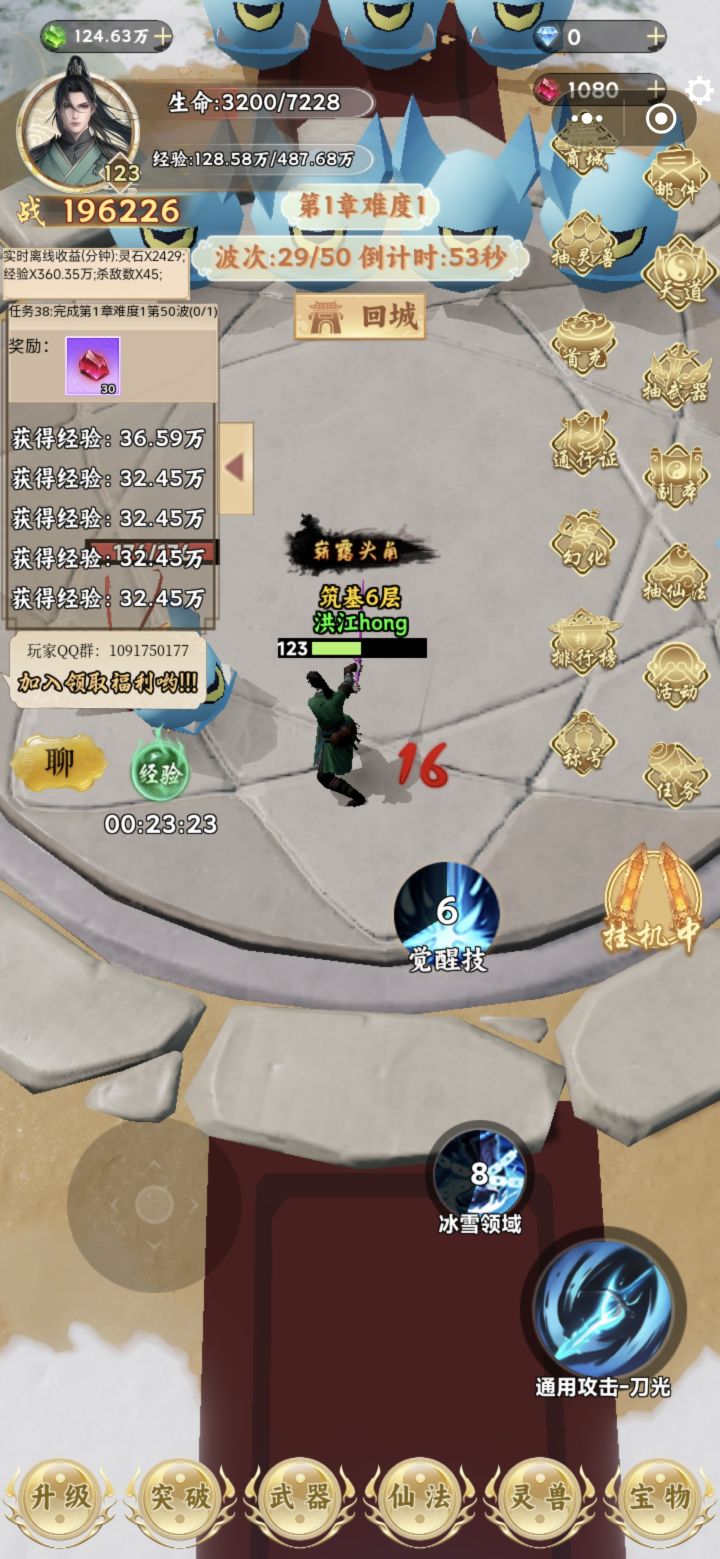 这个游戏节奏就是升级提升境界,按游戏中的任务走到第二章就基本熟悉了。不过要想顺利推图爽玩,首重攻击力,加攻击力的途径是升级加攻击点数,抽武器、制作和强化,升级灵兽附加,装备宝物附加。有了灵兽附加的攻击力,加点攻击不建议,先把暴击率提高到百分百,剩余再加上。抽武器就是挂机灵石区,攒够第三档次的金色宝箱十连的灵石再抽,有没有抽到本章极品金武都可以了,不强求。升级灵兽是既需要灵石又需要灵兽经验,都要挂在
