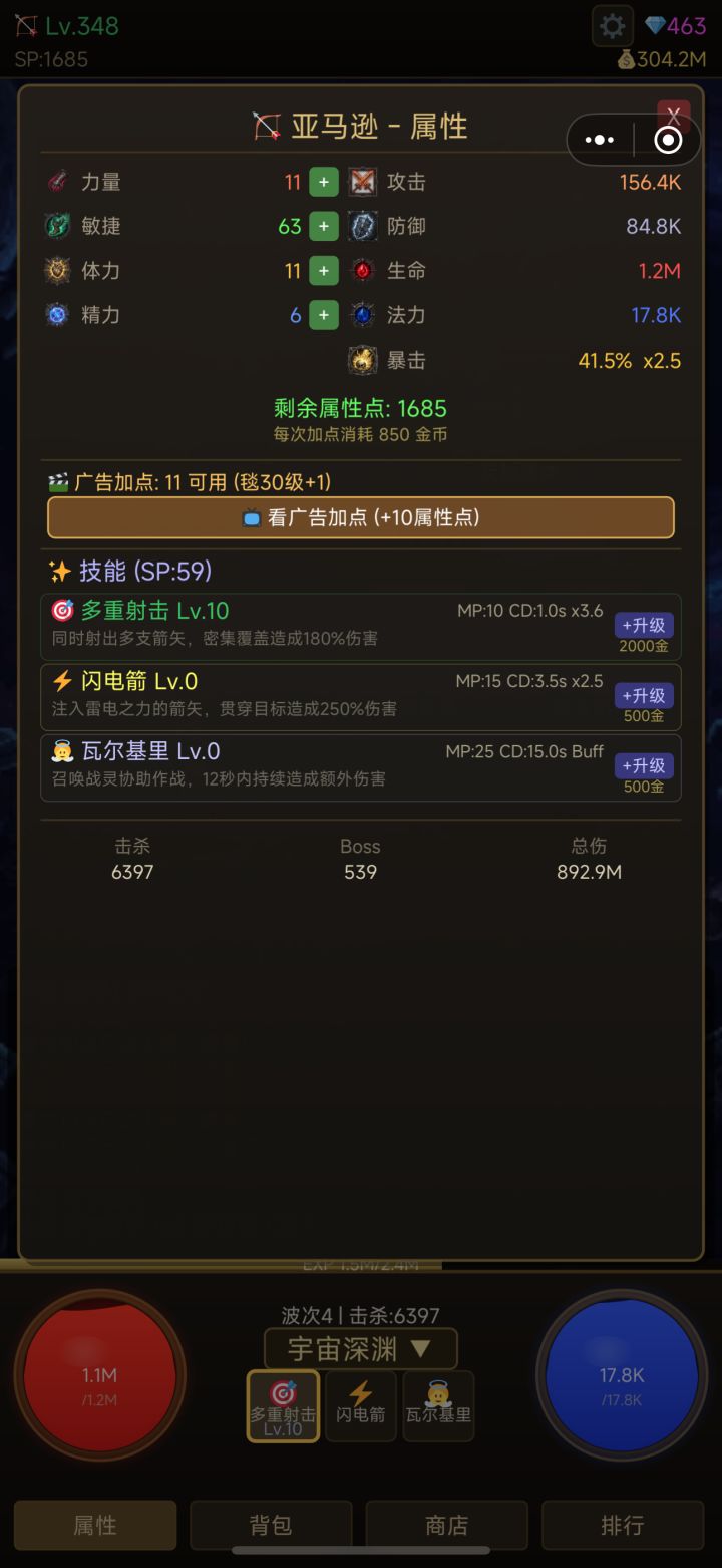 玩了几个小时,发现这个游戏还不错,主要有以下特点1.离线效率是在线一半2.没有强制氪金3.加属性点需要看广告,也就四五个广告就可以加十几点,一会再看广告,再加属性点,这样循环4.有自动换装,自动释放技能,自动售卖,自动…不过这些需要钻石才能开头,钻石可以看点广告,不过每天就10个广告奖励钻石,有点太少了