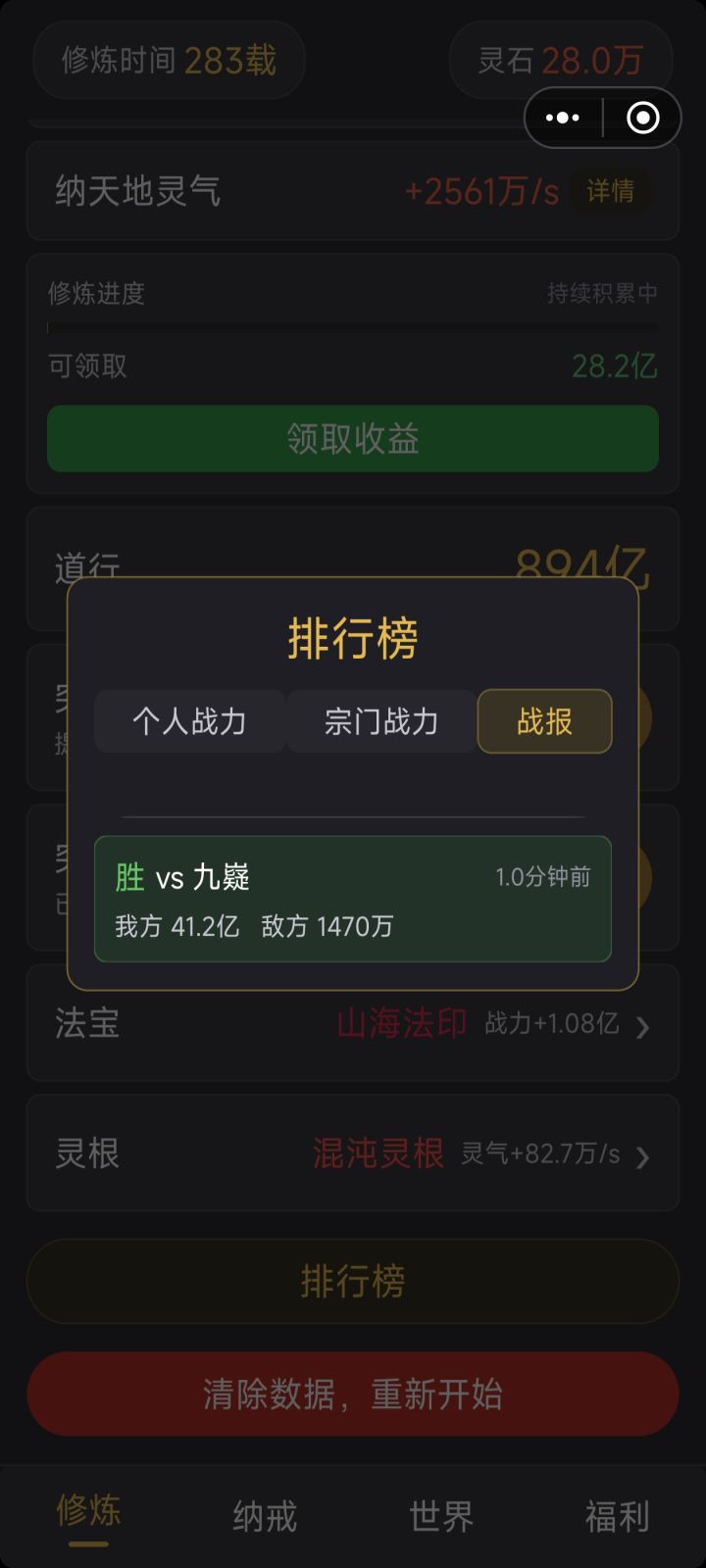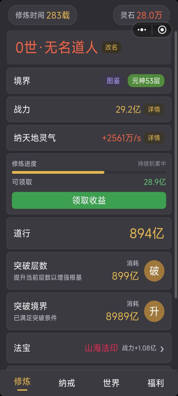 希望本篇能给新来的道友们增添一些助力!! 开局,每日签到可领十万灵石去宝阁抽奖。 背包送的万能转生卡非常难以抽取,尽量让人物多升层级瓶颈后使用转生卡。 每十层可获取本源,本源对伤害有加成,越多伤害越高。 抽取宝阁仙、道、永恒法宝或者灵根可完成成就任务。 道玄灵根>山海法印>其他。 道玄灵根能够加每秒修炼速度,提升更高境界也能获得非常高的战力加成,优先级>法器。