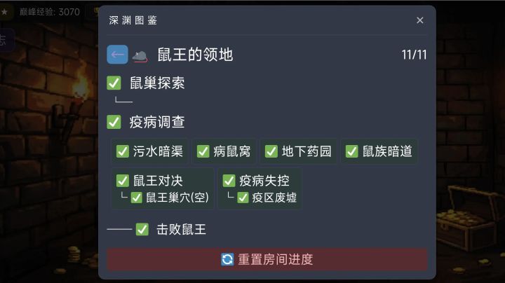 疫病失控触发条件是污水暗渠、病鼠窝、地下药园、鼠族暗道四个分支中的进度足够小(部分卡牌选择后会提示进度+1),如果没有解锁疫病失控,要先重置房间进度,然后在触发裂缝鼠王的领地,第一个会进入鼠巢探索这里必须选择事件,且4-6才能往后继续,否则下次进入的还是鼠巢探索,出了4-6后剧情继续走如果进入了污水暗渠,可以参照图上的走法如果进入了病鼠窝,可以参照图上的走法,不要销毁巢穴,选提取毒素如果进