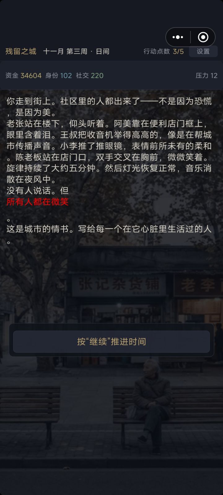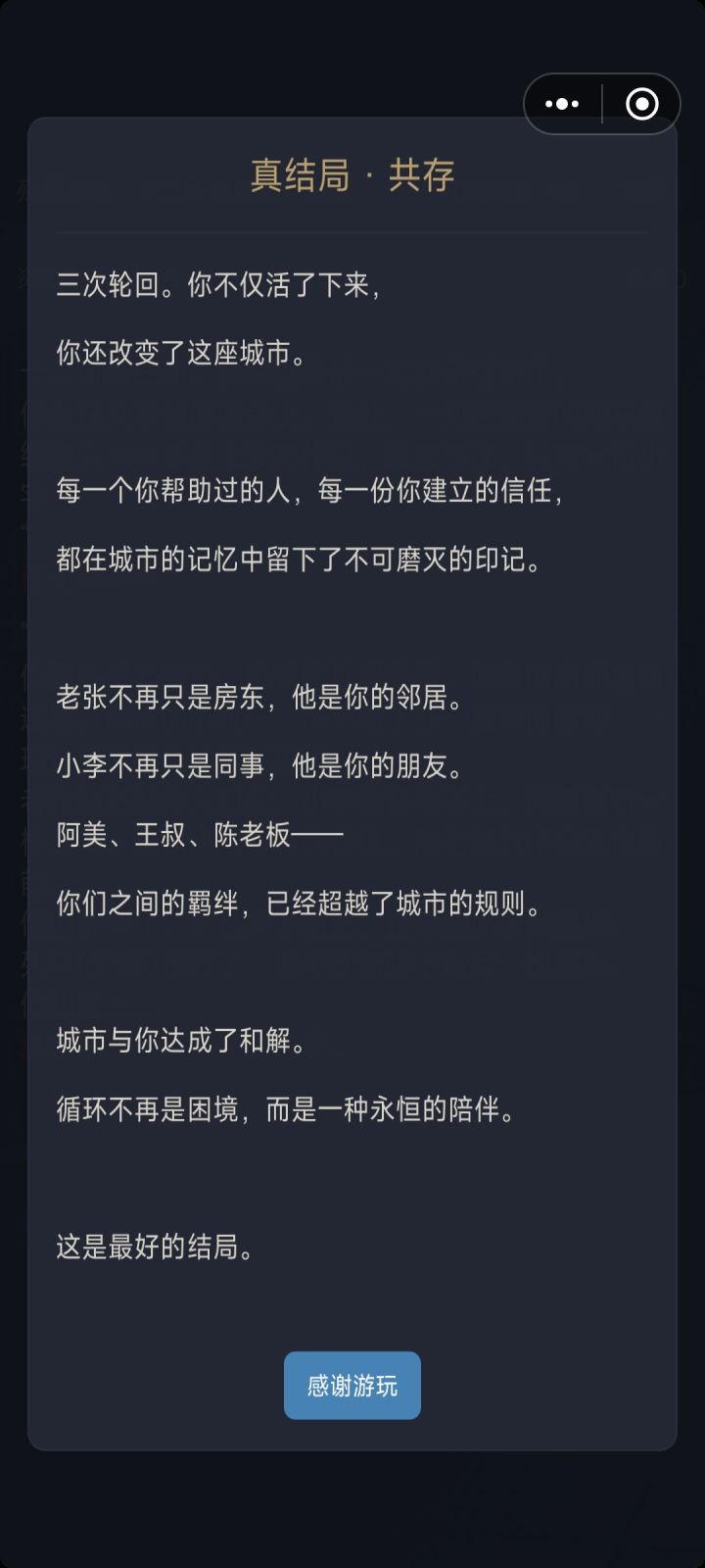 再从游戏的立意上谈一谈吧。其实我没有玩得很明白,刚开始只觉得像无限流副本里的 NPC 觉醒,还觉得带了点恐怖色彩。后来玩下去心里有一种闷闷的感觉, 说不清道不明。其实本人就生活在一个二线小城市的小镇上。这个小镇养育了一代又一代人,也托举了一代又一代人,见证了外来年轻人的到来但更多的是当地人的离开。我时常有一种感觉,就是这座小镇越来越老了,像游戏里的城市,心跳越来越慢,它在努力的活着,但又很悲哀的无法控制的衰老。游戏里说只要我们记住,保留住回忆就够了,但我还是希望,我们也能像游戏里一样找到一个与它共存的方式。