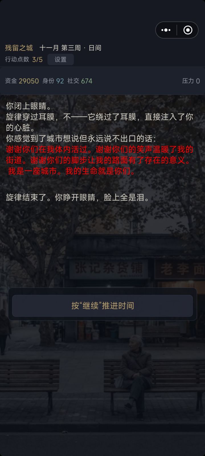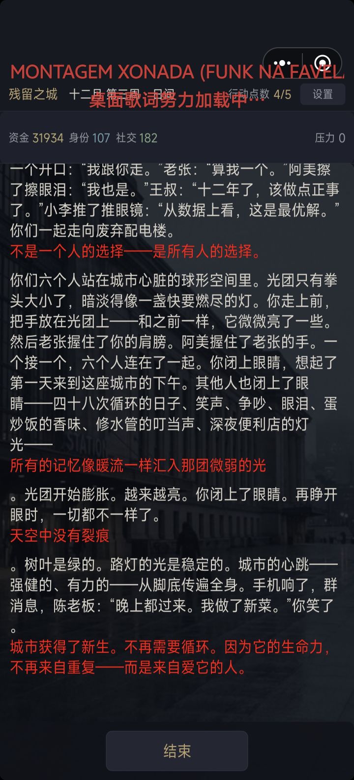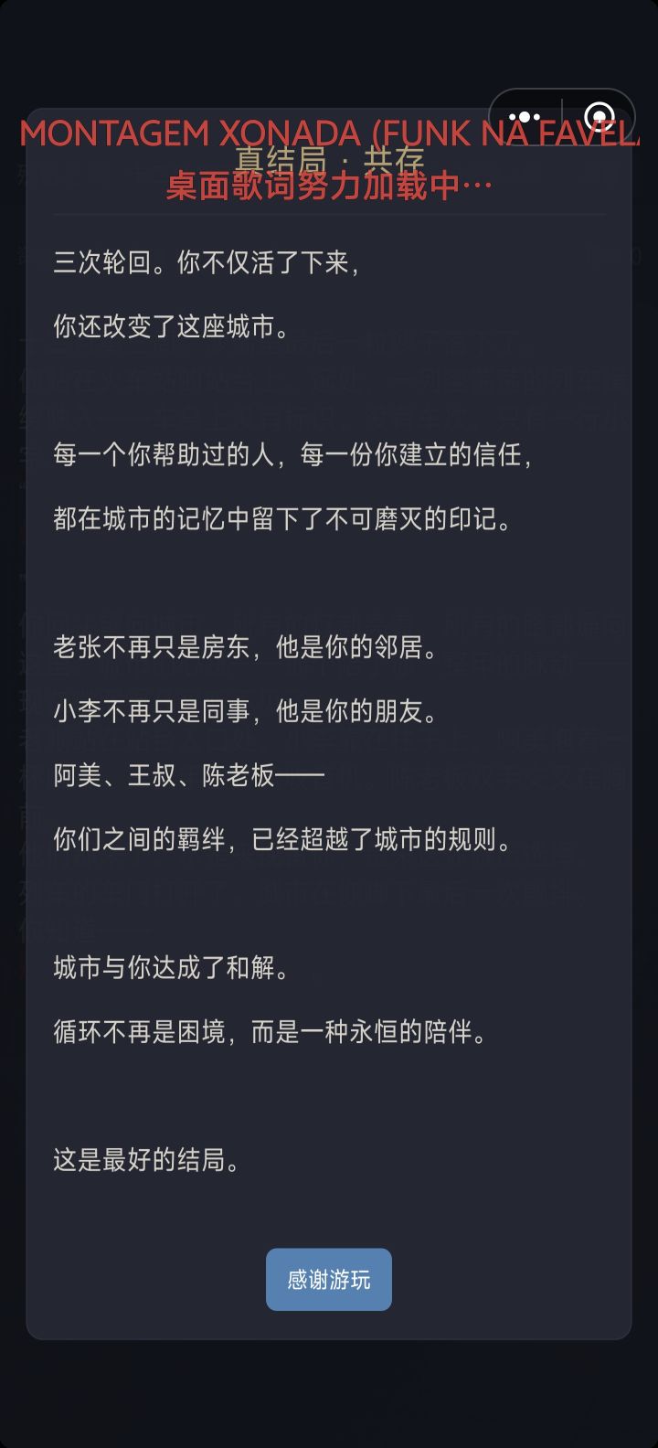 玩家可以通过点击屏幕右上角左侧按钮后呼出菜单点击重新加载尝试更新版本。【存档系统】1.新增 3 个手动存档位,随时保存你的城市生活。2.新增自动存档,每次关键节点自动保存进度。3.读取存档时可查看周目数和保存时间。【留言板功能】1.新增「留言板」入口,在标题画面即可进入,查看其他玩家的留言。2.玩家在通关三周目后可发表留言,每人可发表一条留言(最多 50字),也可修改已发表的内容。【