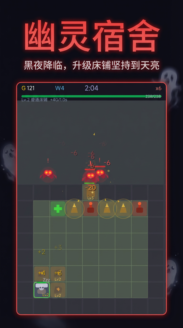 要熄灯了,猛鬼宿管来了!在宿舍楼中寻找床铺躺下,建造炮台和防线抵御猎梦者,升级床铺获取更多金币,坚持到天亮即可获胜!