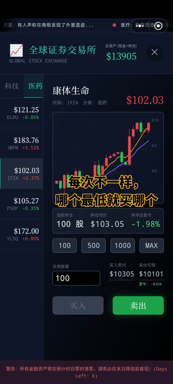 上来啥也不用干,直接把贷款全部吃完,每天问亲戚借款(第一天先问亲戚借款再贷款,第一天全贷款会直接进入第二天,少一次借钱机会),然后全部买入医疗里面每股最低的那个股票 微信聊天记录有就点一下 王总会爆5000金币:选 收到马上到-好的,谢谢王总 小胖爆两万:选 你看到什么了-急需用钱,有多少借多少 老妈爆五万:这个有时候爆有时候不爆 王经理爆五千:选直接提现吧 龙哥选保重不用还钱,不然就得还5000