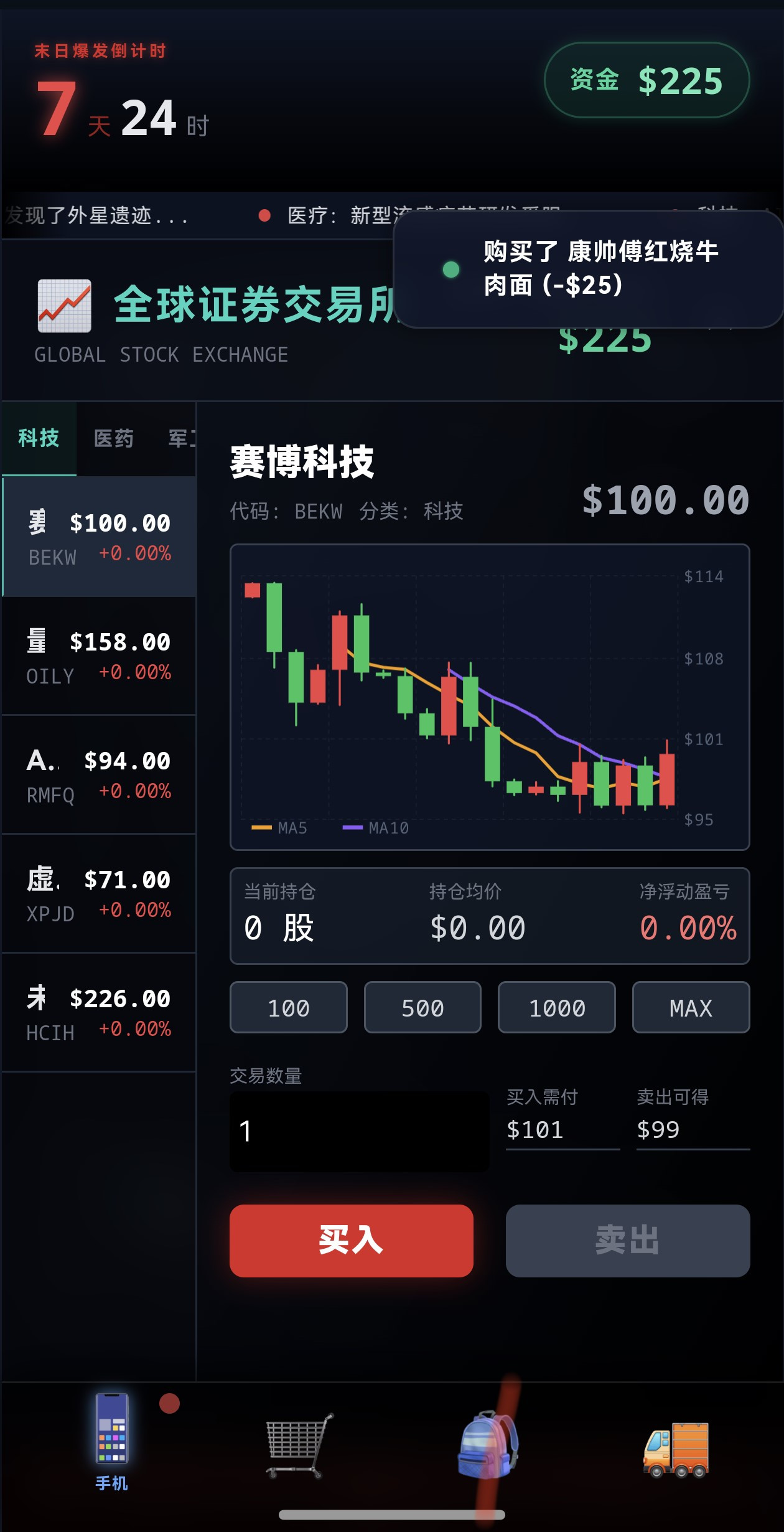 (1)开局怎么速刷钞票:前期什么都不用管,直接进务工,速刷送外卖,在第二天刷到流浪老人,拿他的送的指环陀螺去卖,接着拿所有钱去买医疗股票,只买最贵的那只股票,随后直接速刷劳务,卡最后4—5小时,全部套现,在接着在二阶段直接饿死,拿结算保底有5000局外钻石,重复5次,就能拿到25000的局外钻石,就能直接把局外养成的车辆等级拉满。 (注意):特殊事件,手速不要太快,不然会点错,导致重开一把。 (2