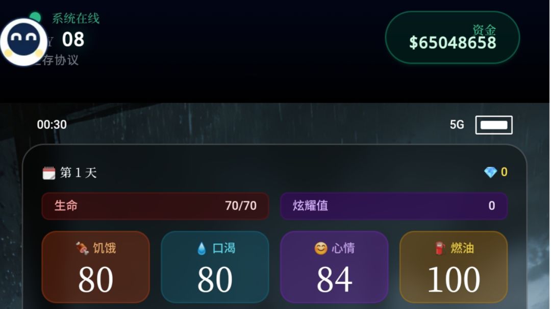 (1)开局怎么速刷钞票:前期什么都不用管,直接进务工,速刷送外卖,在第二天刷到流浪老人,拿他的送的指环陀螺去卖,接着拿所有钱去买医疗股票,只买最贵的那只股票,随后直接速刷劳务,卡最后4—5小时,全部套现,在接着在二阶段直接饿死,拿结算保底有5000局外钻石,重复5次,就能拿到25000的局外钻石,就能直接把局外养成的车辆等级拉满。 (注意):特殊事件,手速不要太快,不然会点错,导致重开一把。 (2