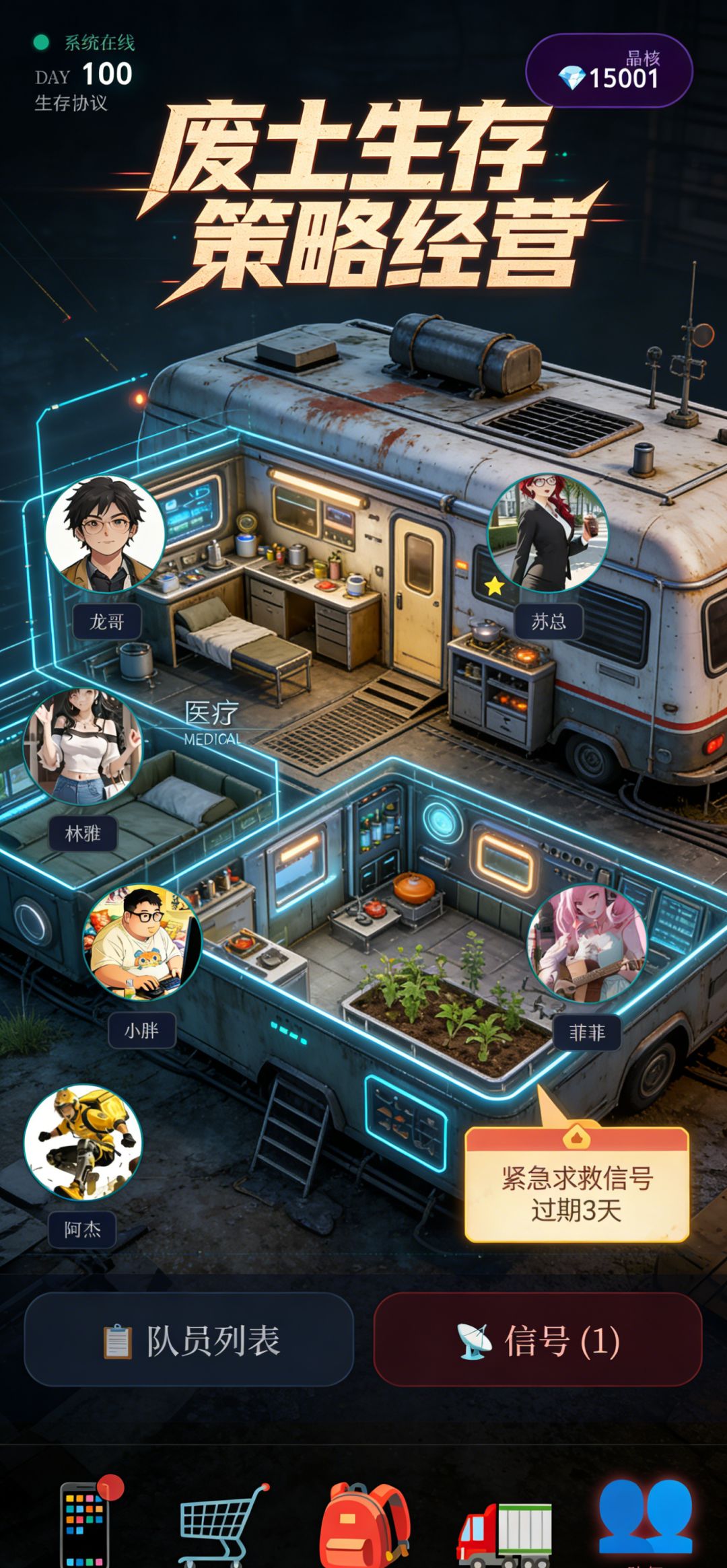 #末日房車攻略末日房車攻略 末世:我有一輛房車 1-100天全階段攻略 核心:穩生存、控電力、滿倉賣、等降價、造懸浮頂配房車,拒絕亂花錢,靠自給自足衝百天永動 一、前期(1-30天:奠基求生) 1-7天:開局搞錢+基礎囤貨 - 資金:靠勞務、親友借款穩定攢錢,不碰高息貸,施舍乞丐換指尖陀螺賣50w啟動金 - 物資:按限購買——壓縮餅乾10塊/次、自熱米飯3盒/次、火腿腸50根/天