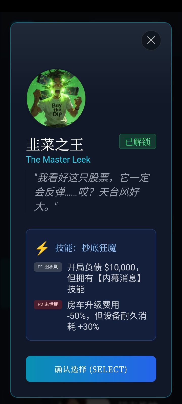 (当前版本大学生P1阶段刷钱上限最高)。前六天不买任何物资只买最贵的医疗股(注意股票要一次性买,不要分批,红色按钮点一次就会过2小时时间)。