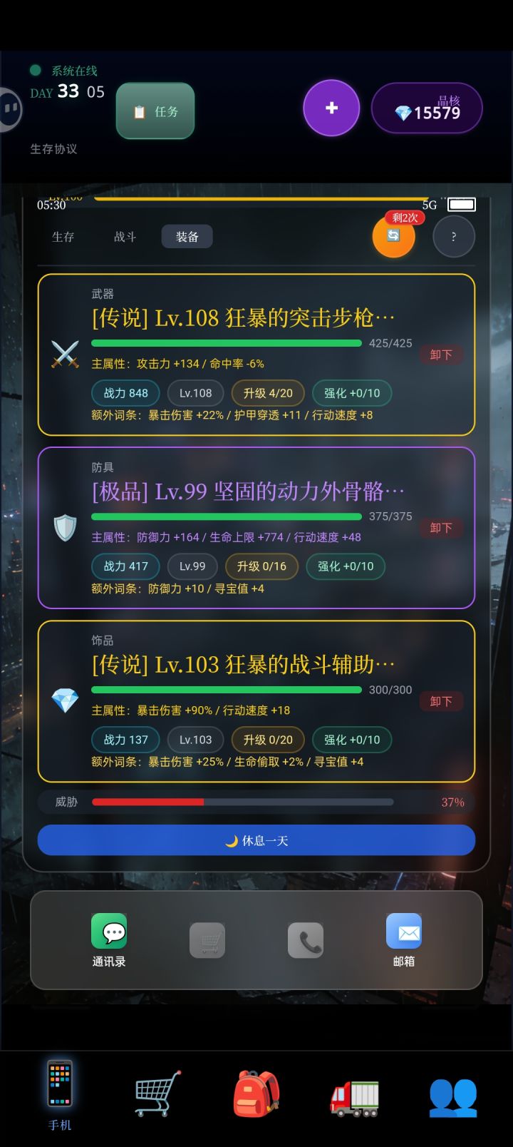 新版后,进入废墟收刮物资,爬层要一次100层太累太耗休息时间了!!这才第一旧街,简易,背包才只能装64格物品,除了所有食材能一次性任务内无限迭加,武器,装备,只要装满64格后,既无法再取,第五军设施那,地狱,背包爬第6层就装满了!,因该设置每次坎,每次下去搜索,爬过5~10~15等可以选择从何层开始,而不是都从第一蹭搜起,,玩下墓游戏也是不可能一次性搞完所有层的搜索,,而搜索的目的是为了物资与通关,,一次性需要爬100层,,怎搞,不吃不喝不睡啊!!