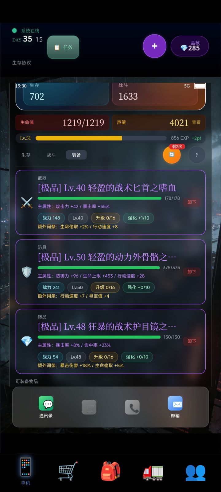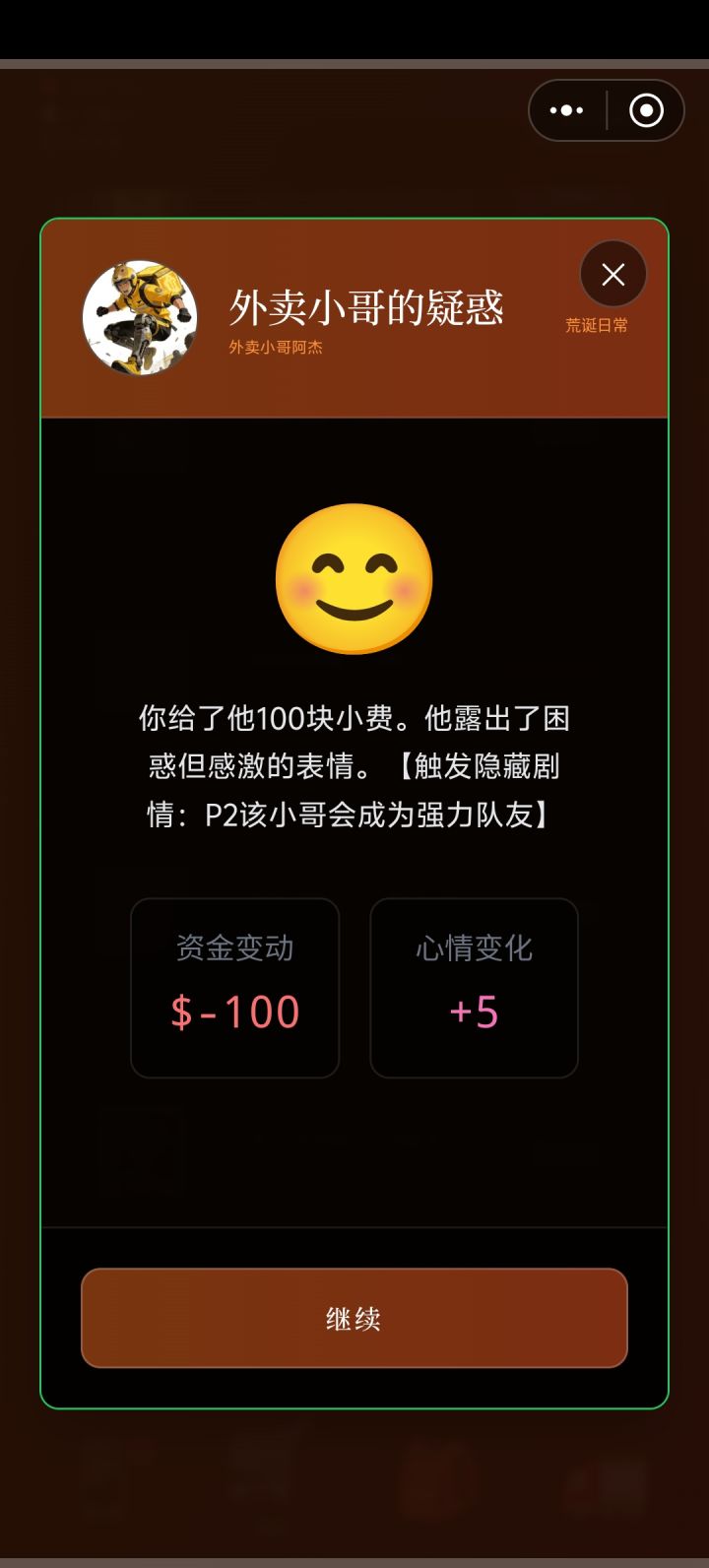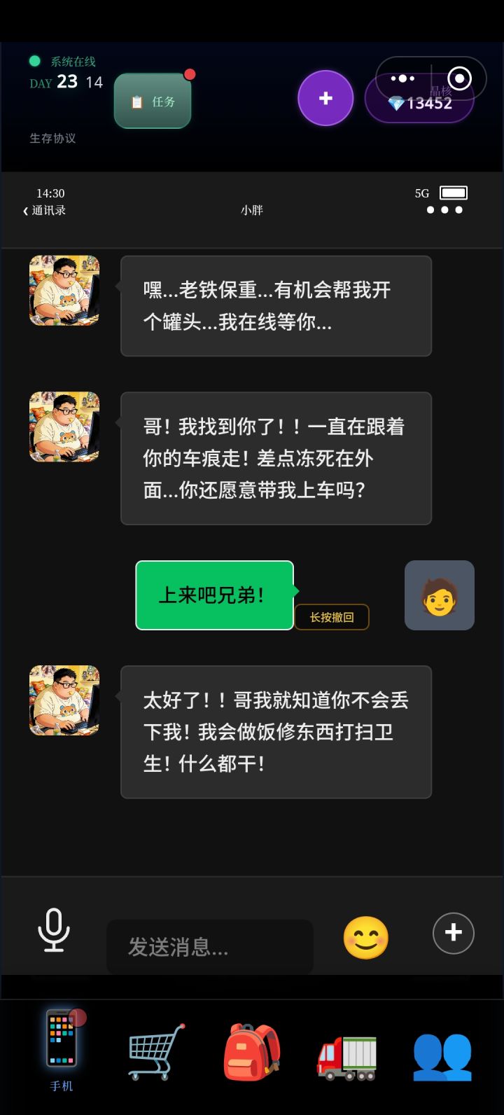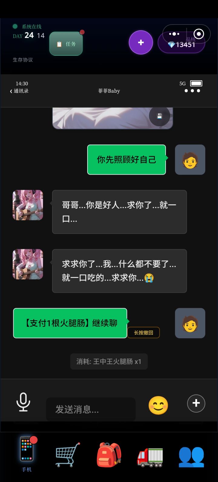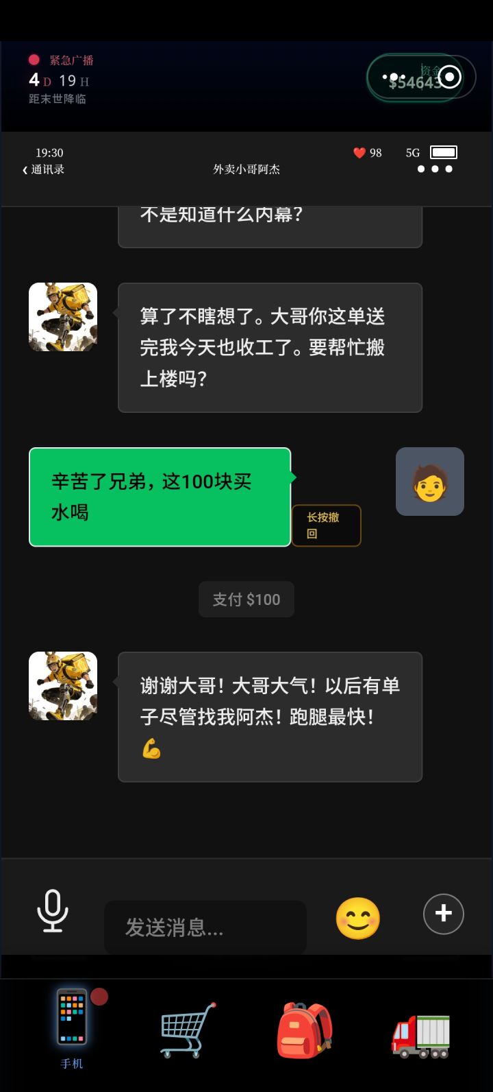 第一次玩的新鲜感特别强,后面转生几次全部拉满后就有些乏味了。虽然探索特别枯燥,但好在不需要探索也可以通关,我这个档只探索了一次刷个任务就退了。(温馨提示,第一次玩推荐自己玩一玩熟悉操作,以下是我的攻略。)首先刷星源。必选007工具人,过微信流程必拿王经理的2000,胖子的20000,老板的200和团建的5000(重点!所有亏钱选项统统避雷!因为这几个档优先刷星源。)第一天,先问亲戚借钱,
