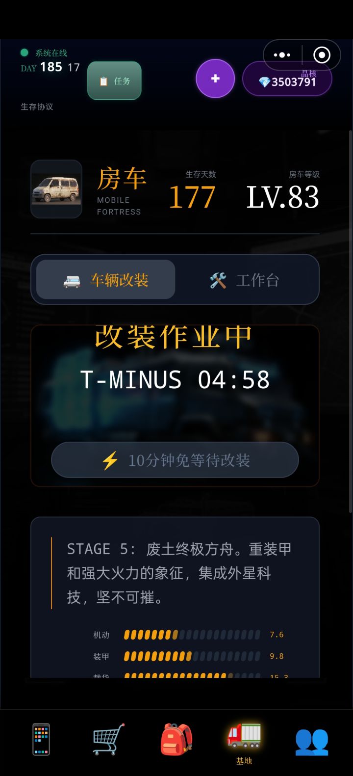 (1)开局怎么速刷钞票:前期什么都不用管,直接进务工,速刷送外卖,在第二天刷到流浪老人,拿他的送的指环陀螺去卖,接着拿所有钱去买医疗股票,只买最贵的那只股票,随后直接速刷劳务,卡最后4—5小时,全部套现,在接着在二阶段直接饿死,拿结算保底有5000局外钻石,重复5次,就能拿到25000的局外钻石,就能直接把局外养成的车辆等级拉满。(注意):特殊事件,手速不要太快,不然会点错,导致重开一把。(2