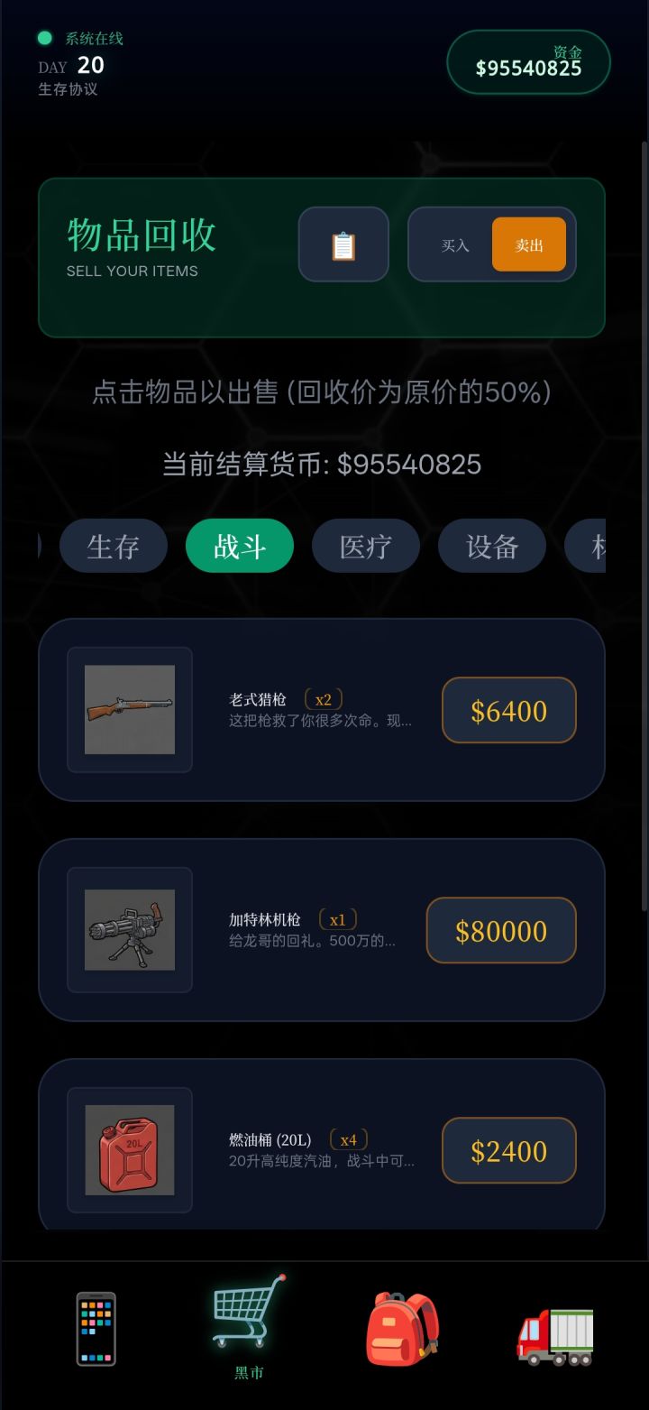 强化只选钱。第一天先借贷,张口要钱。然后送汉堡拿到陀螺直接买,拿到胖子的两万后。打开股市,点医疗,全买基因科技。一直到最后一天不足24小时的时候全卖。其余时间就劳务选捡垃圾,做做剧情就可以了。注意⚠️一定要在最后一天不足二十四小时内卖掉股票。期间有钱就买股票,第一天买好材料,食品就买火腿肠,水,冰可乐就可以了,后续不需要买水,有机器造。用这个方法的回来记得点赞👍👍👍#浅评一下